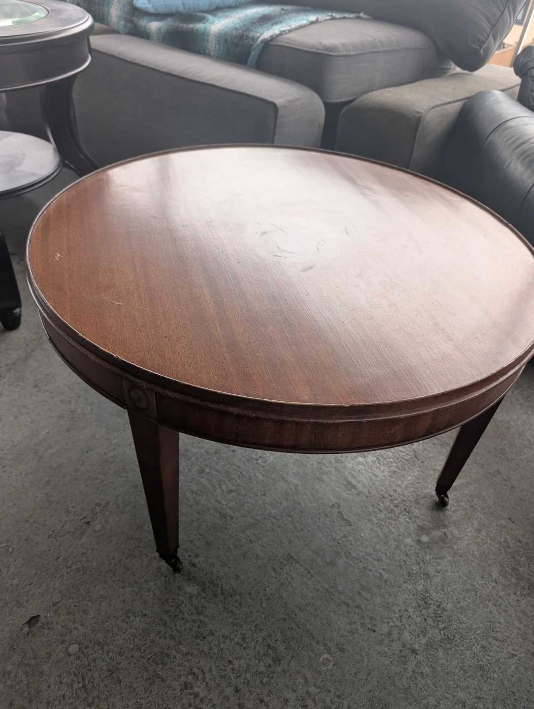 Selling a round wooden coffee table! It has a classic design with a smooth, dark wood finish, perfect for any living room. The table features elegant detailing around the edge and sturdy legs with small wheels for easy moving. A great addition to your home!