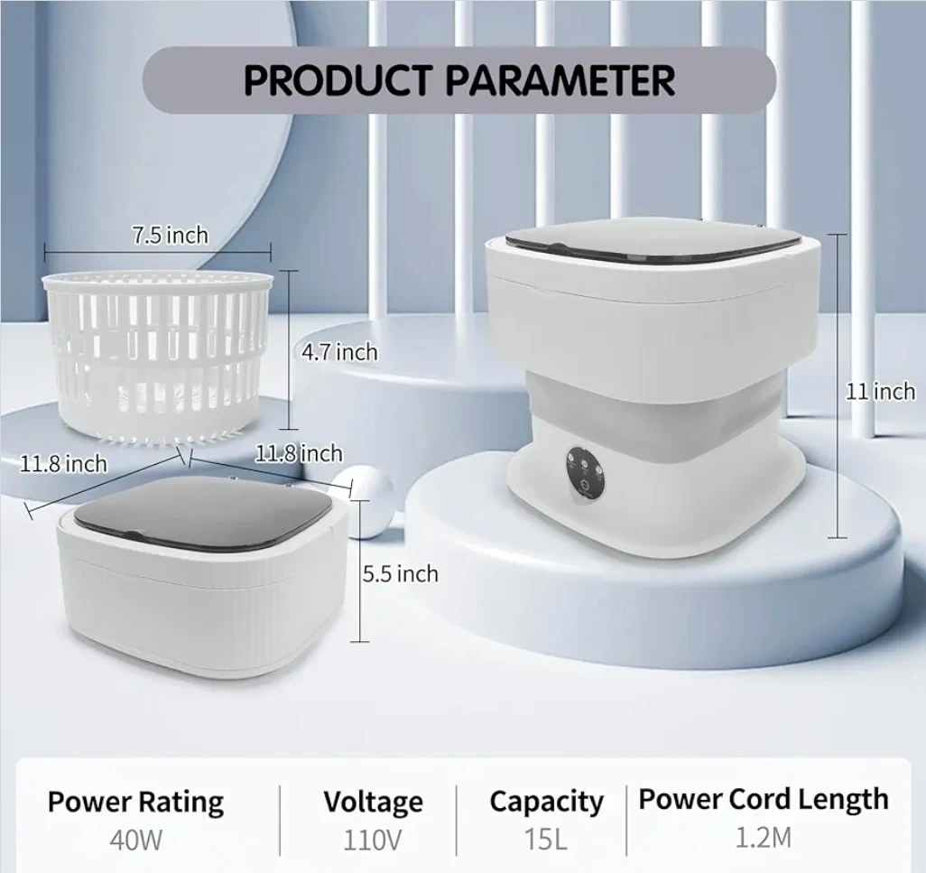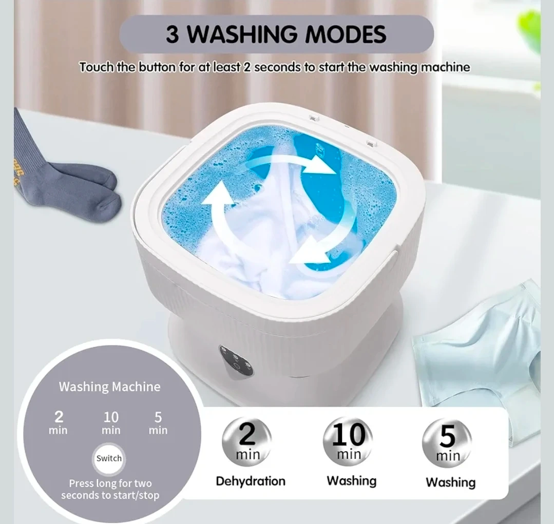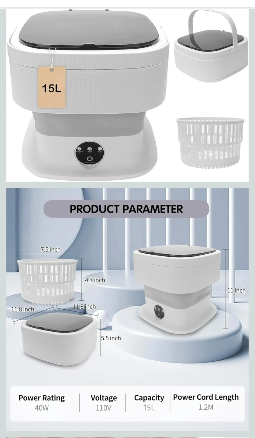 I'm selling a portable mini washing machine with a 15L capacity! It features 3 washing modes and a blue light for efficient cleaning. It's great for washing small items like socks, underwear, baby clothes, and more.