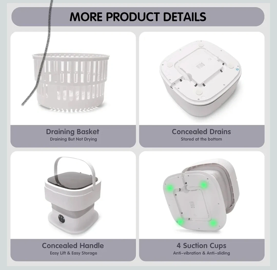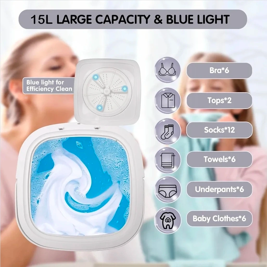 I'm selling a portable mini washing machine with a 15L capacity! It features 3 washing modes and a blue light for efficient cleaning. It's great for washing small items like socks, underwear, baby clothes, and more.