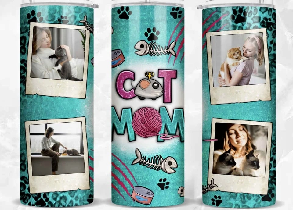 20oz custom Cat Mom tumbler. Double wall stainless steel, comes with plastic lid and metal straw.