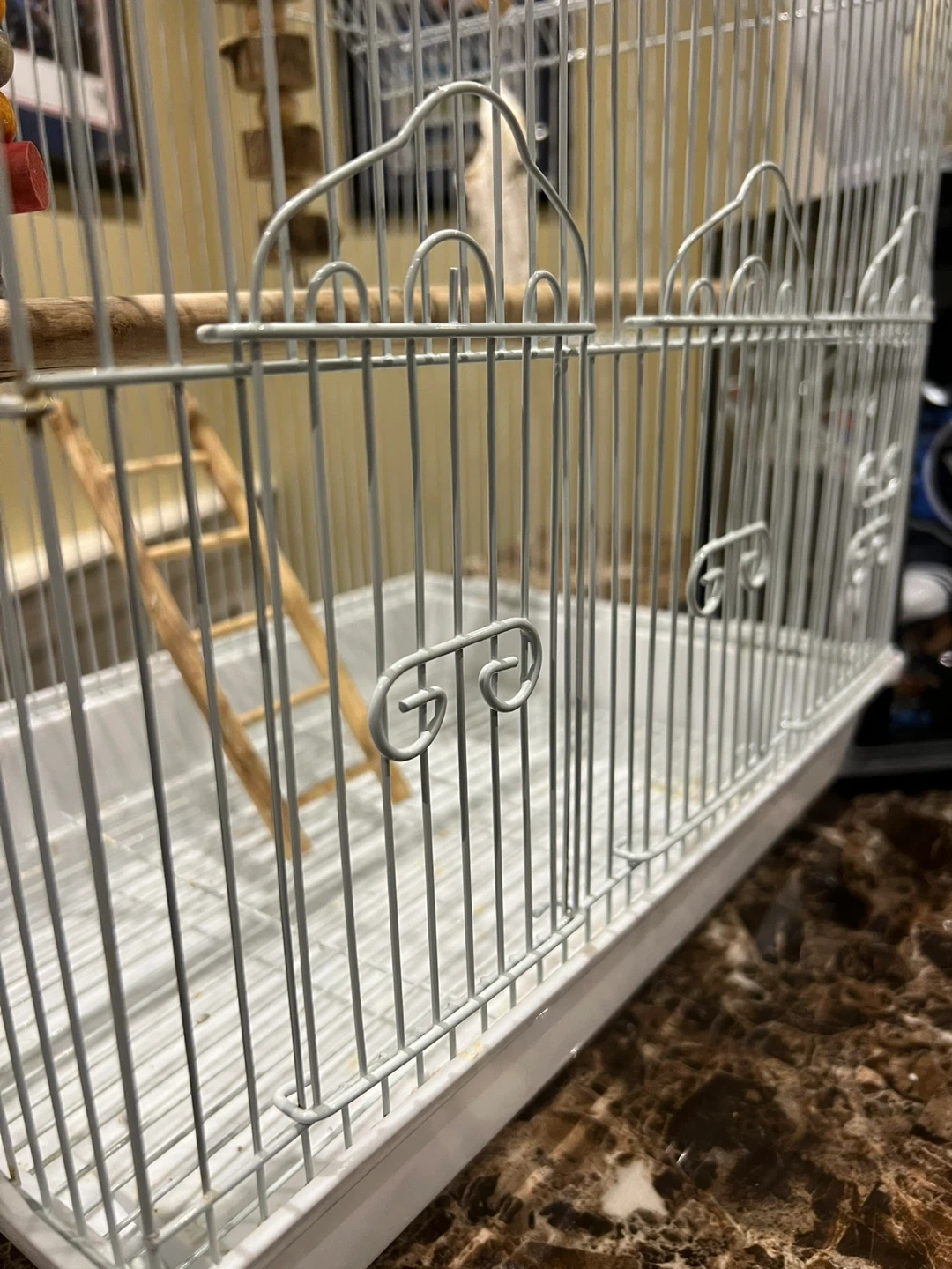 Selling a bird cage that's in great shape! It's white and comes with some fun accessories for your feathered friend, including a ladder, perches, and a colourful beaded toy with bells