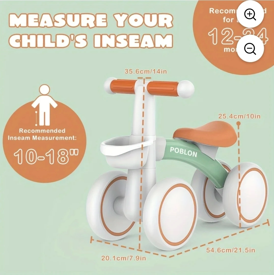 Check out this cute POBLON baby balance bike! It's perfect for little ones aged 12-24 months. The bike features a comfy seat and easy-grip handlebars. It is recommended for inseam measurements of 10-18 inches. It is white, green and orange.