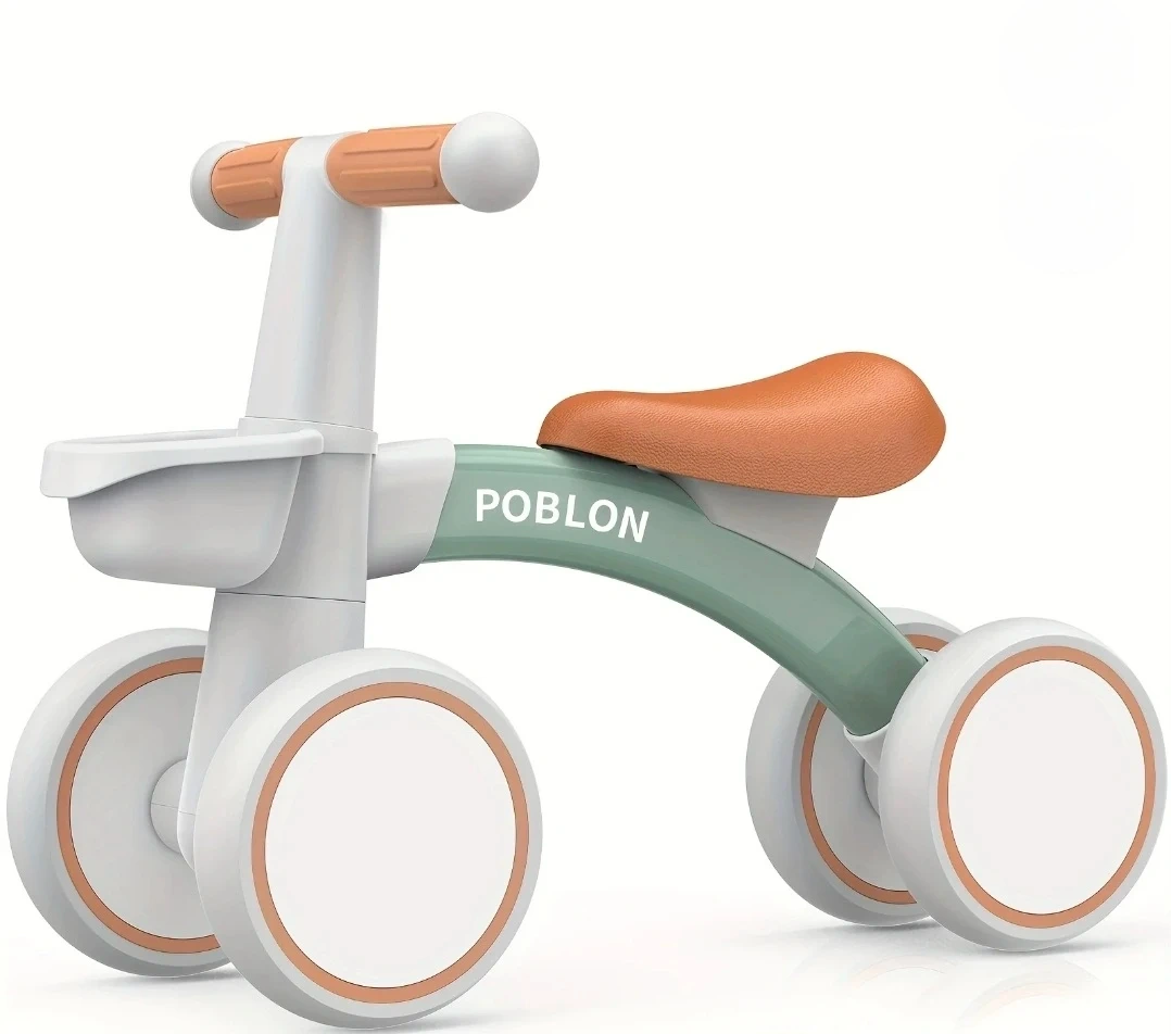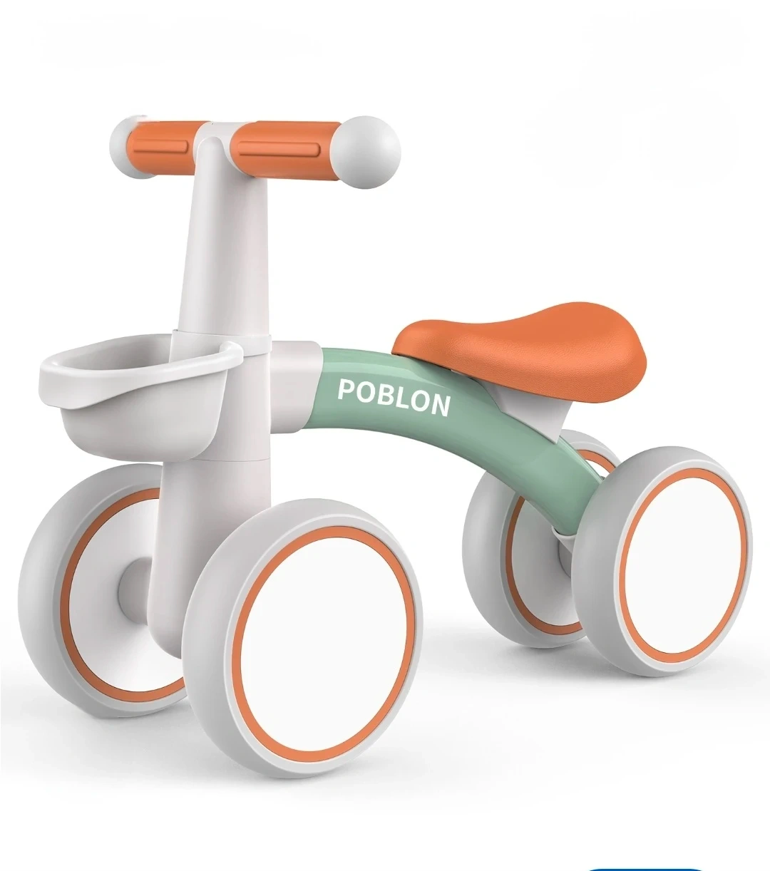 Check out this cute POBLON baby balance bike! It's perfect for little ones aged 12-24 months. The bike features a comfy seat and easy-grip handlebars. It is recommended for inseam measurements of 10-18 inches. It is white, green and orange.