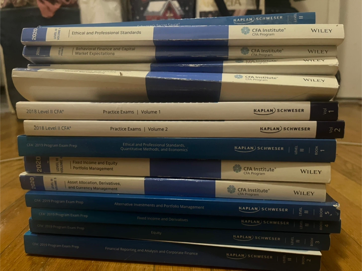 Selling a collection of CFA Program Exam Prep books by Kaplan Schweser. Includes various levels and years, covering topics like Ethical and Professional Standards, Behavioral Finance, and Fixed Income. Great for anyone studying for the CFA exams