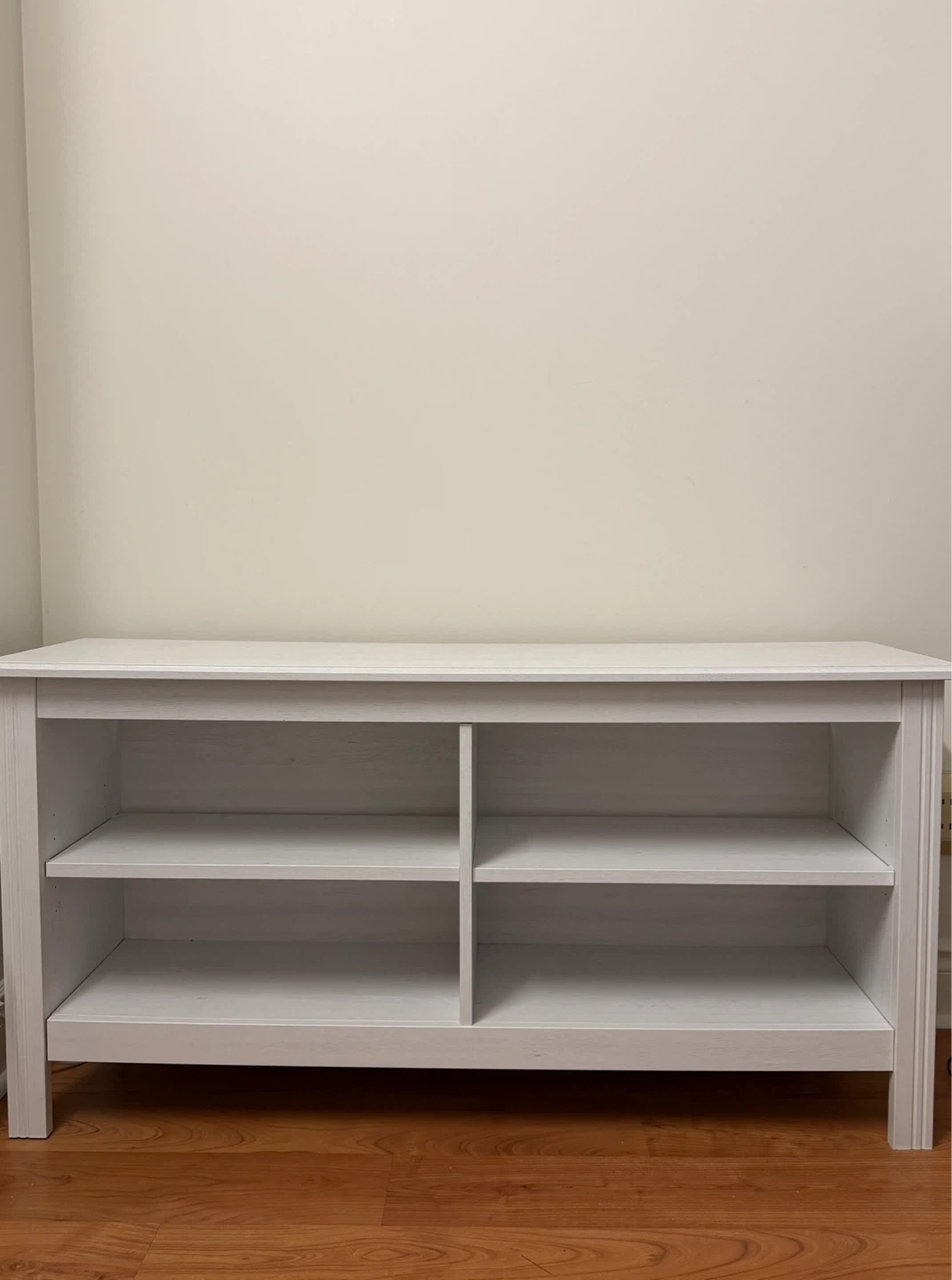 Selling a white TV stand or console table. It features a simple, clean design with open shelving, perfect for storage and display. The unit appears to be in good condition and would be a great addition to any living room or entertainment area