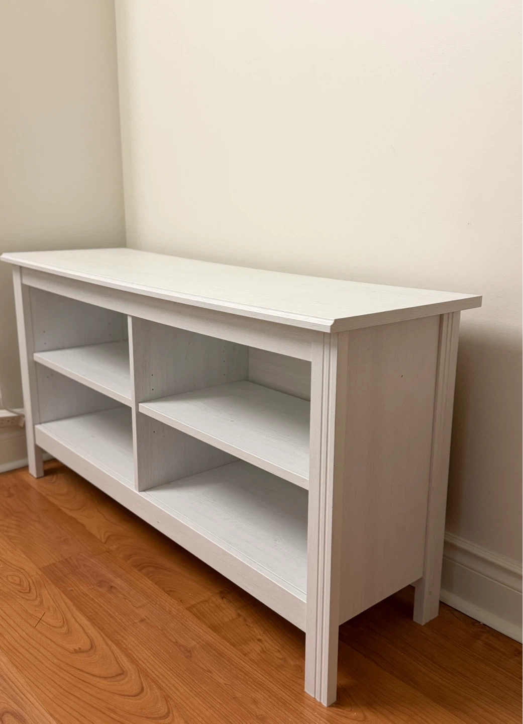 Selling a white TV stand or console table. It features a simple, clean design with open shelving, perfect for storage and display. The unit appears to be in good condition and would be a great addition to any living room or entertainment area