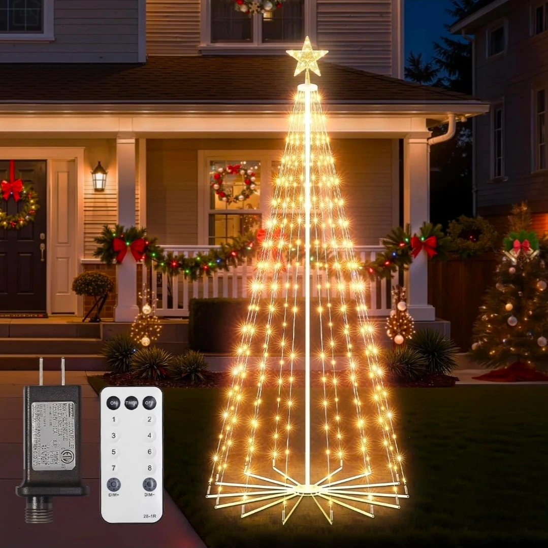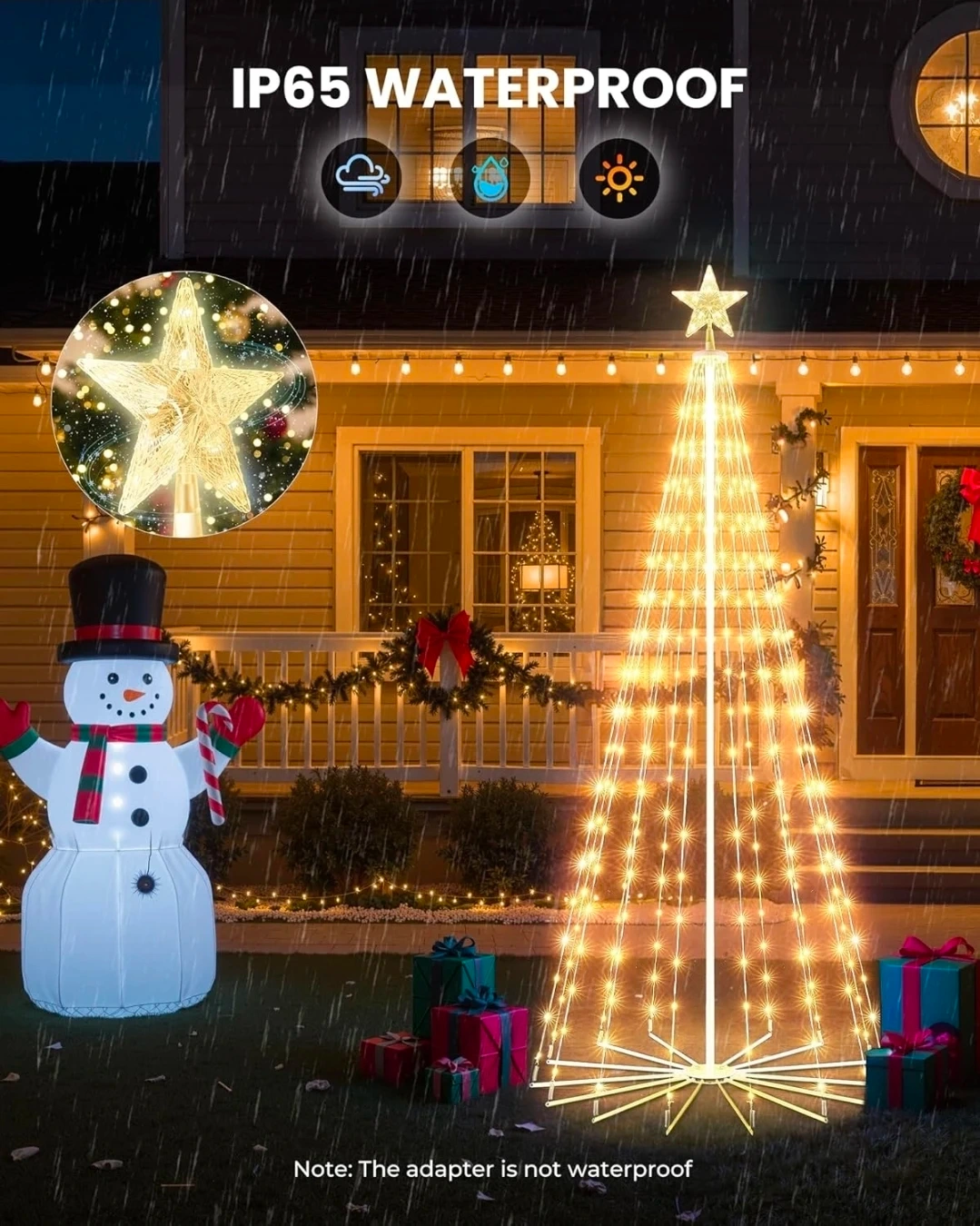 Get ready for the holidays with this festive Christmas tree string light! It features a star topper and is IP65 waterproof, perfect for outdoor use. The remote and timer offer 8 different lighting modes, including twinkle, steady on, and slow fade. Please note the adapter is not waterproof
