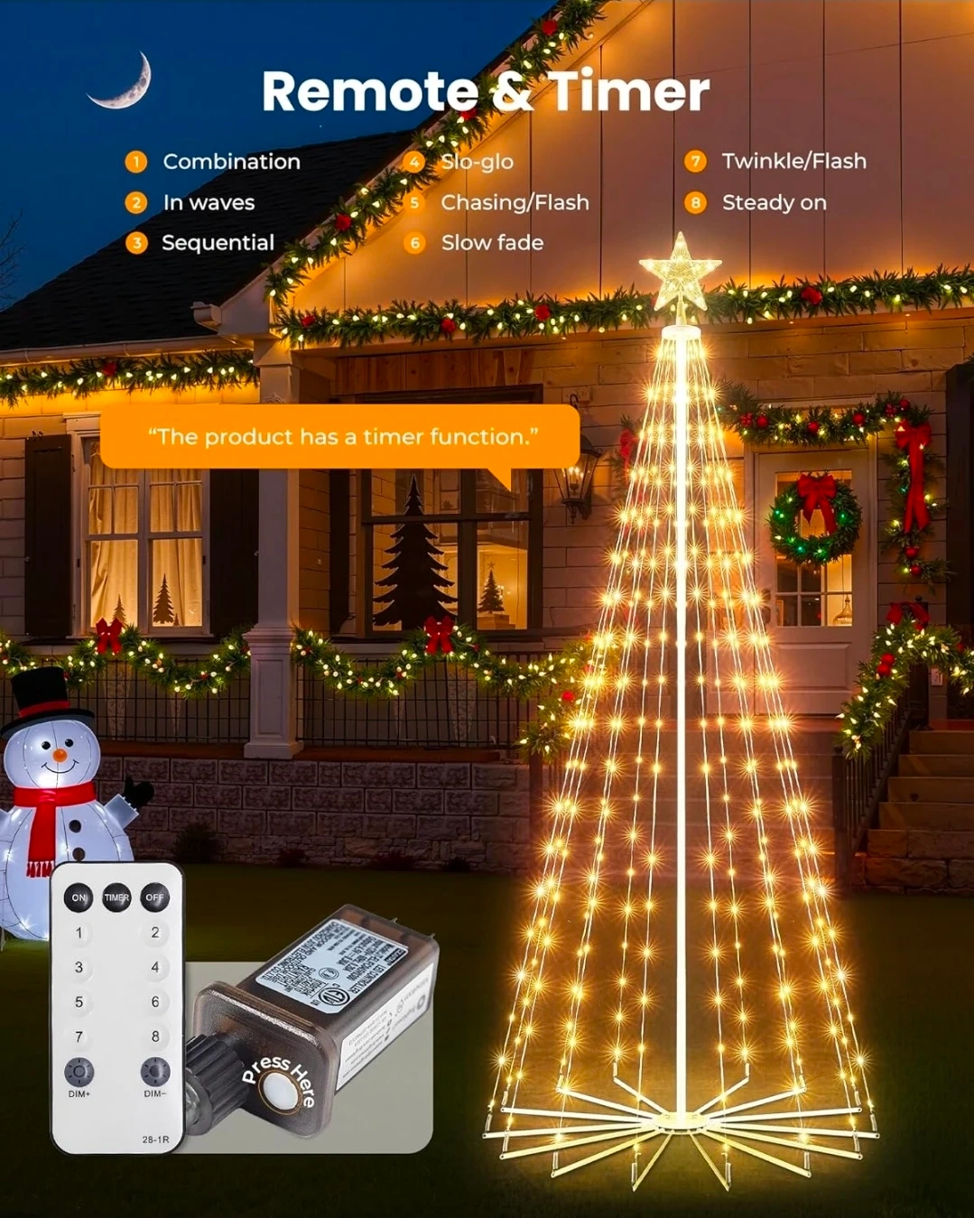 Get ready for the holidays with this festive Christmas tree string light! It features a star topper and is IP65 waterproof, perfect for outdoor use. The remote and timer offer 8 different lighting modes, including twinkle, steady on, and slow fade. Please note the adapter is not waterproof