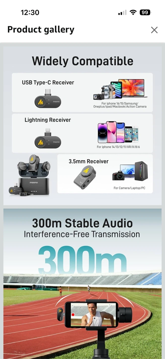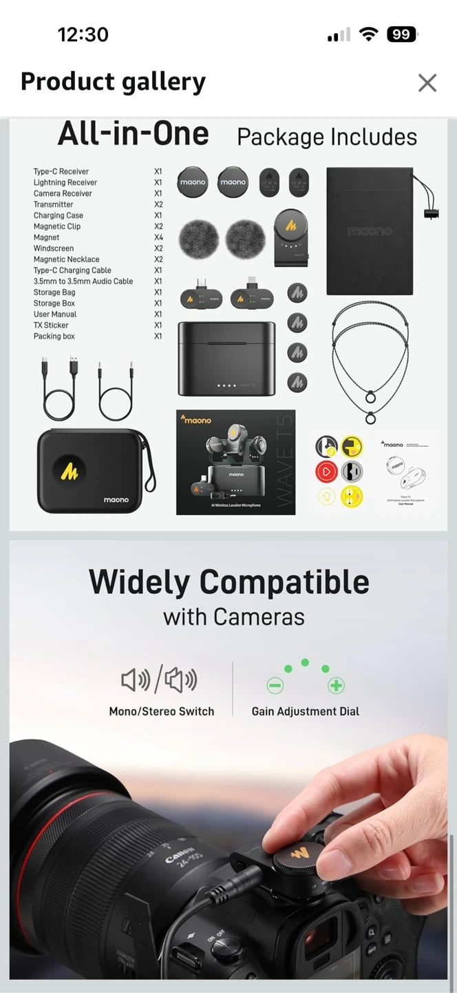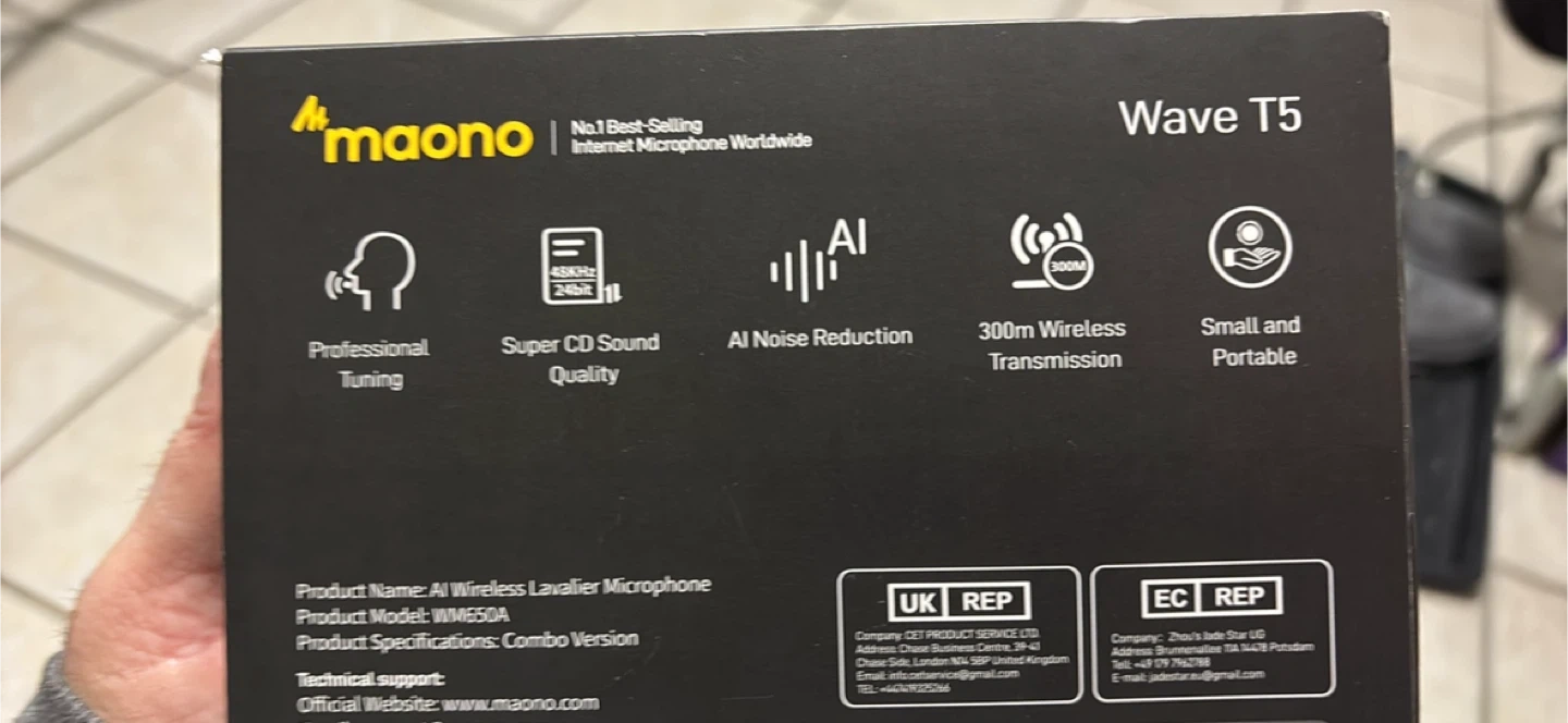 Selling a brand new Maono Wave T5 wireless lavalier microphone! This all-in-one package includes everything you need for studio-quality audio recording. It's widely compatible with various devices, including cameras, laptops, and PCs, thanks to its USB-C, Lightning, and 3.5mm receivers. The package includes: