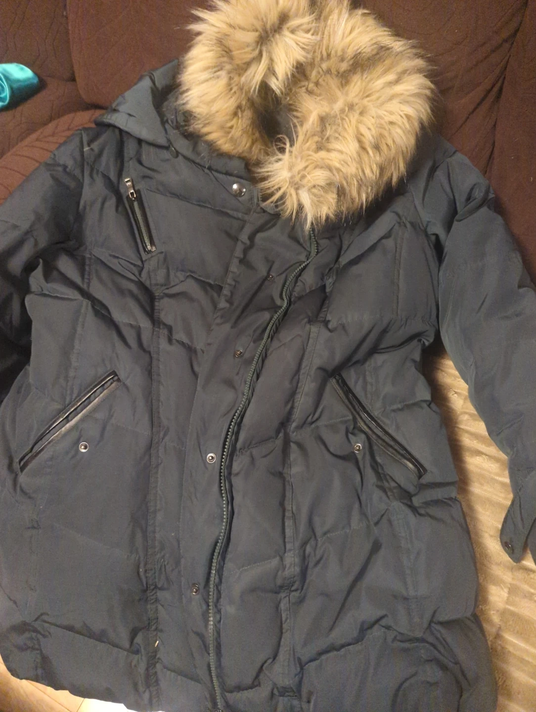 Here's a cozy puffer coat with a fur-trimmed hood! It's perfect for staying warm during the colder months. The coat features a zippered front and pockets, and it's in good condition.