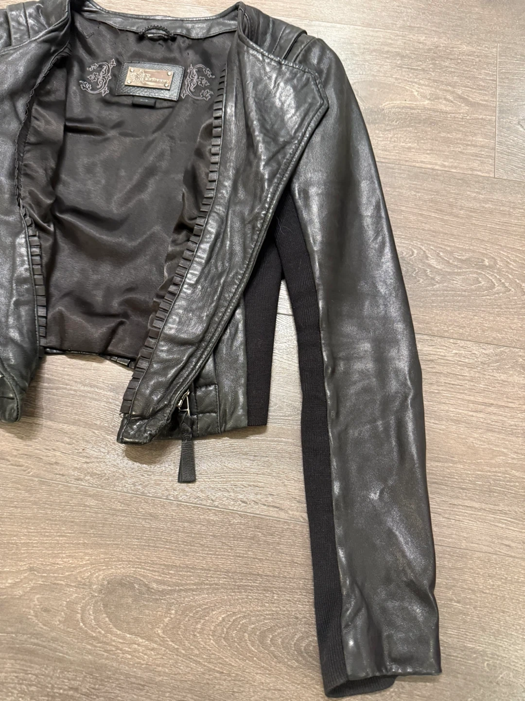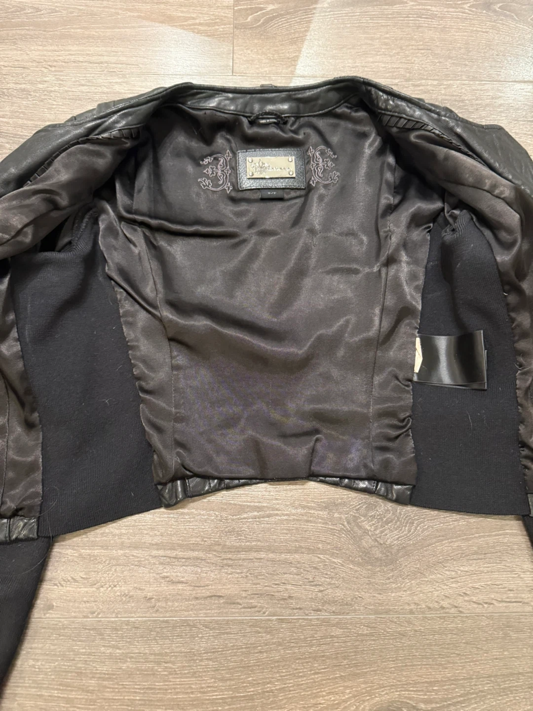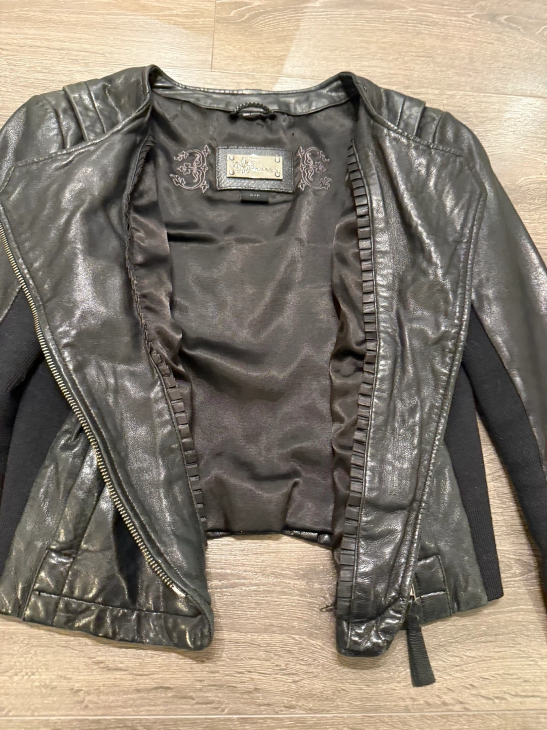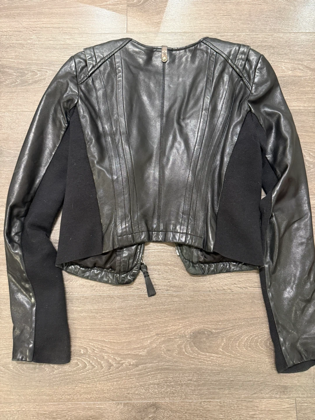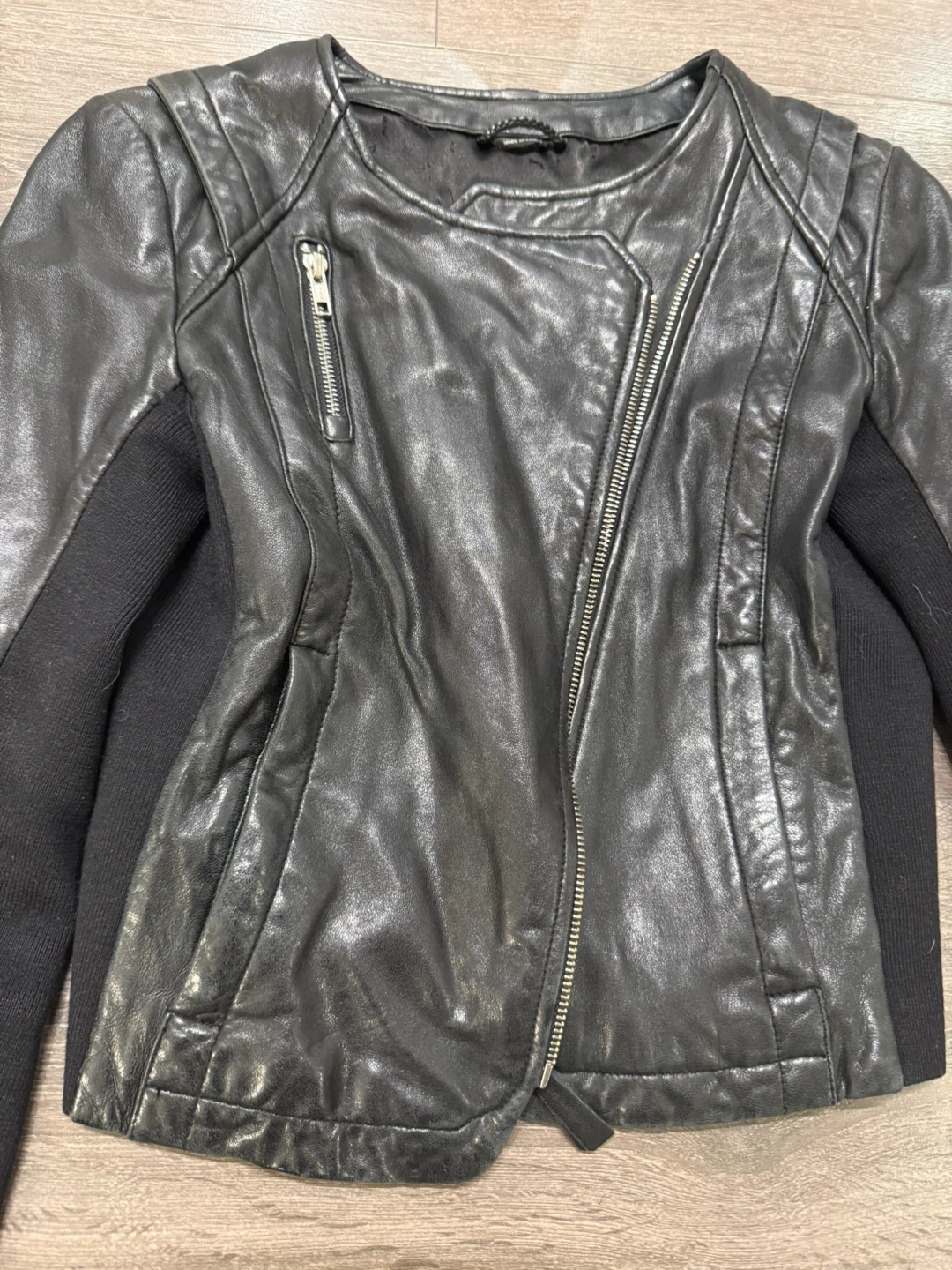 Selling a stylish Mackage black leather jacket in size small! It features an asymmetrical zipper and a unique design with knit sleeves. Great for adding a bit of edge to any outfit!