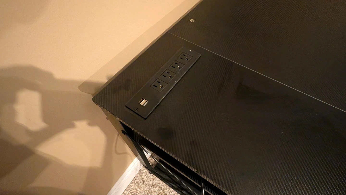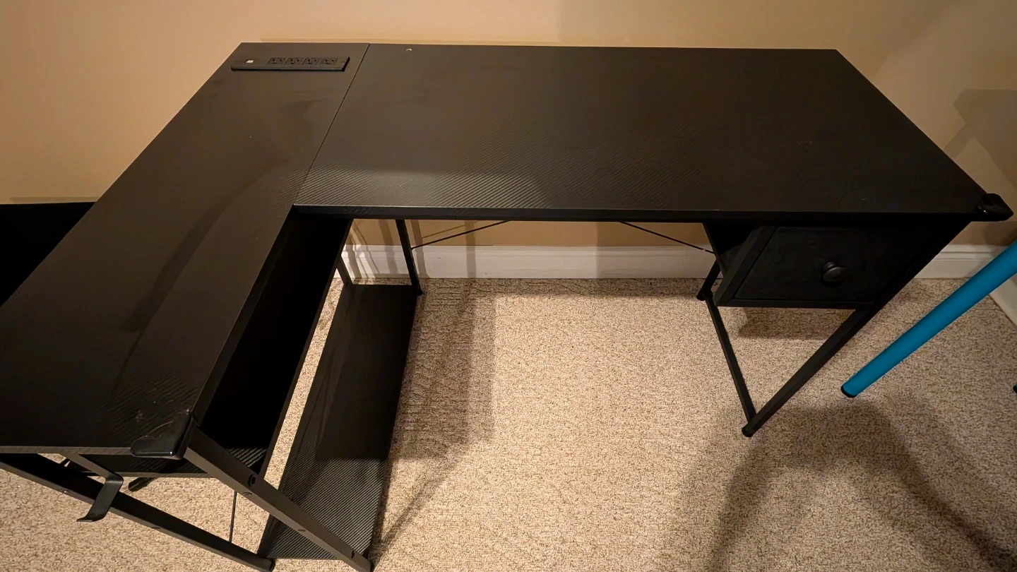Selling a black L-shaped gaming desk. It's in great condition and has a sleek, modern look. It also features a built-in power strip and USB ports for easy access to power and charging for your devices. Perfect for a home office or gaming setup!