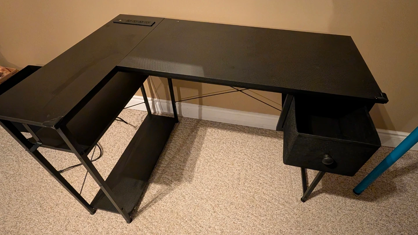 Selling a black L-shaped gaming desk. It's in great condition and has a sleek, modern look. It also features a built-in power strip and USB ports for easy access to power and charging for your devices. Perfect for a home office or gaming setup!