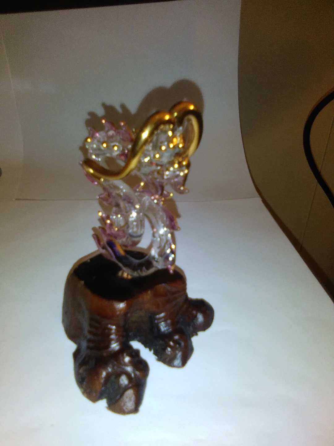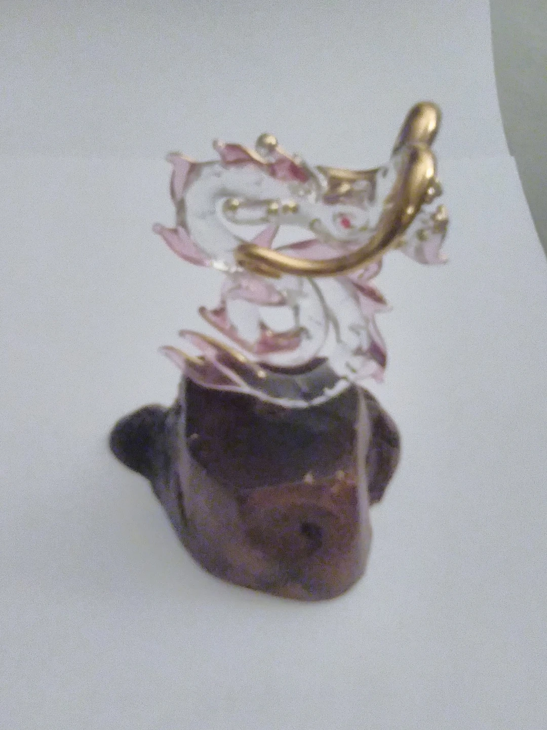 Unique glass dragon figurine with gold accents, mounted on a rustic wood base. Adds a touch of whimsy to any space!