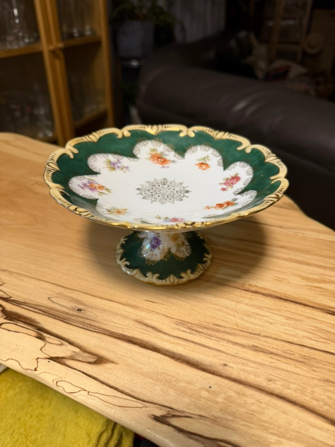 Selling a lovely vintage Vienna Austria pedestal dish. It features a beautiful floral design with a green and gold trim. Perfect for displaying treats or adding a touch of elegance to your home!