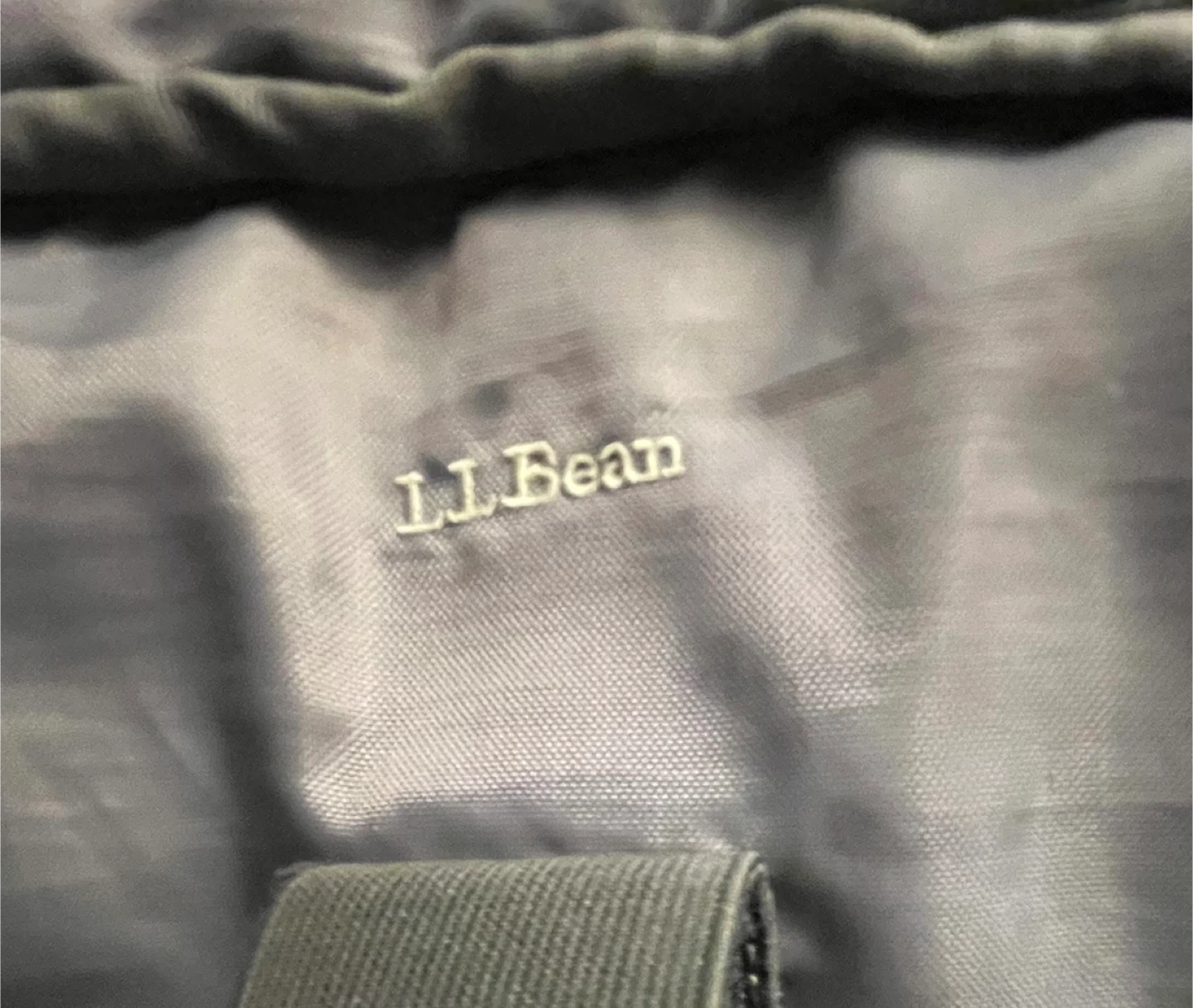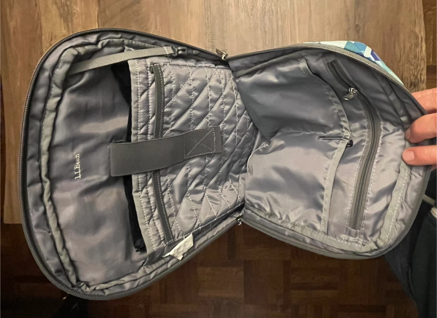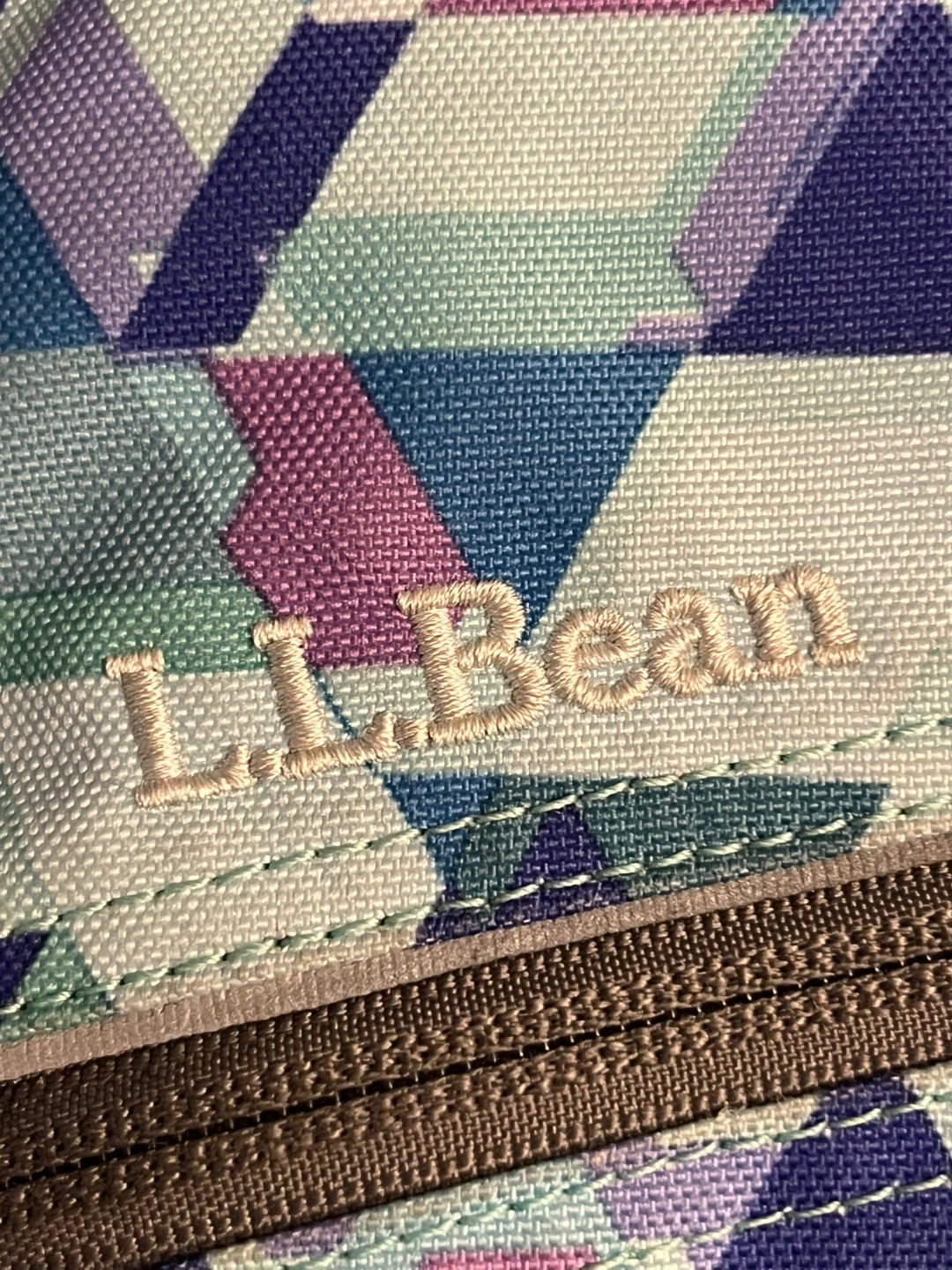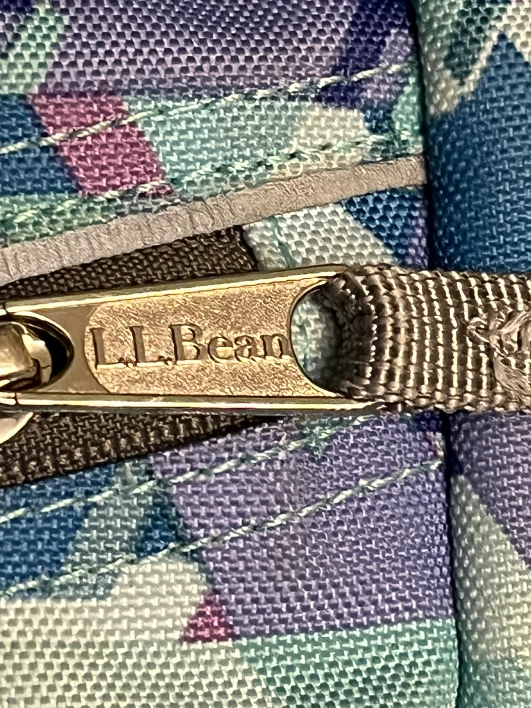 Selling a L.L.Bean laptop bag. It has a geometric design with shades of blue, purple, and green. The interior is grey and has multiple compartments for organization