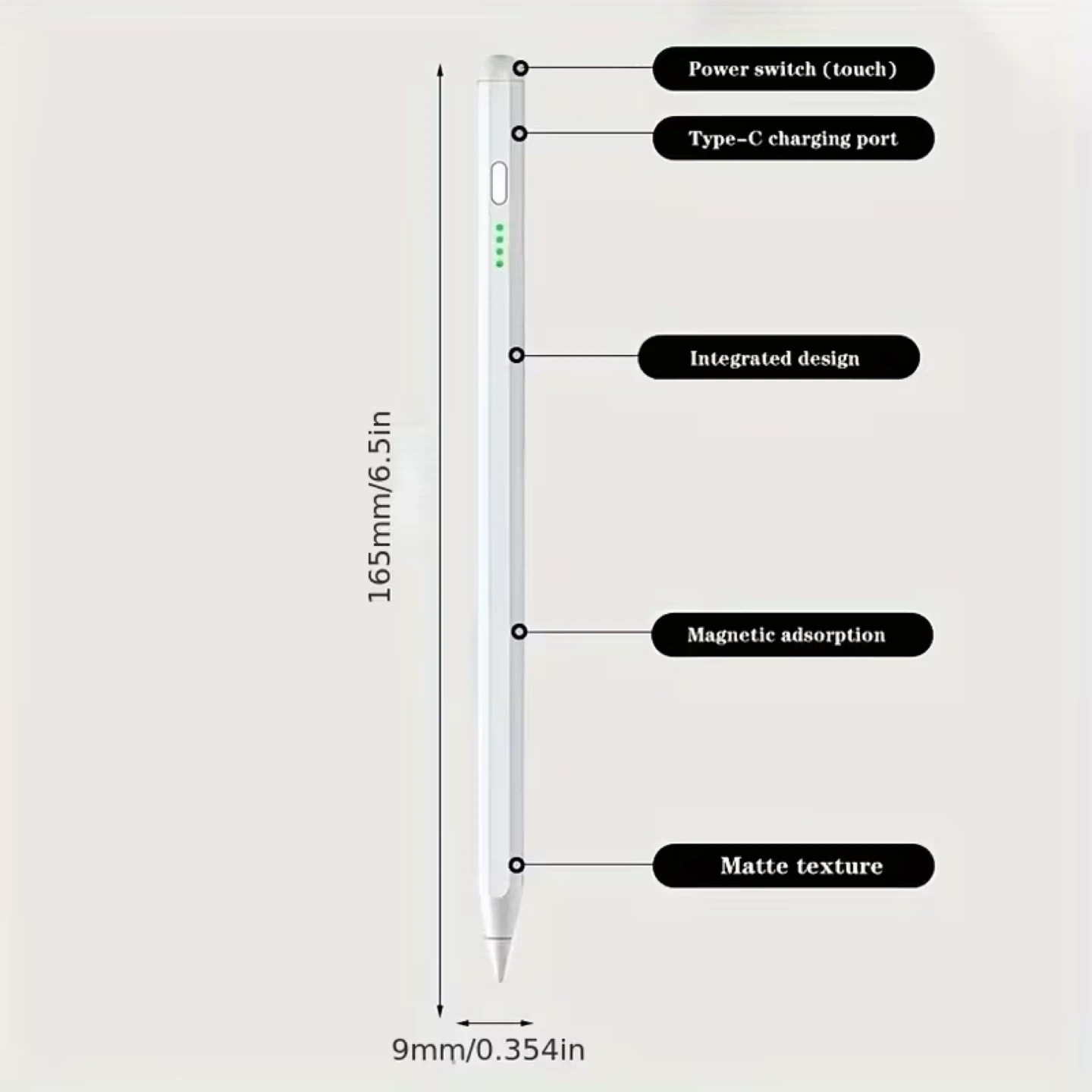 Selling a stylus pen compatible with a variety of devices, including iPhones, iPads, Samsung, Xiaomi, and Huawei tablets and phones. It features a matte texture and magnetic adsorption. This stylus has a Type-C charging port and a touch-sensitive power switch. It measures 165mm/6.5in in length and 9mm/0.354in in diameter
