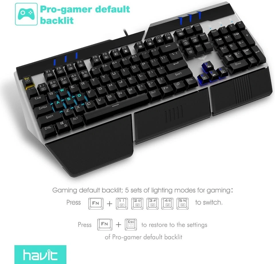 - Customizable Pro-gamer mode: Press FN+INS to switch to Pro-gamer mode, only W, A, S, D, ESC, "↑" "↓" "←" "→" 9 keys are default to be lighted, 5 default modes can be chose by pressing FN+ 1-5; And these 5 modes are allowed to be customized the backlit color and lighting mode by pressing FN+ HOME.