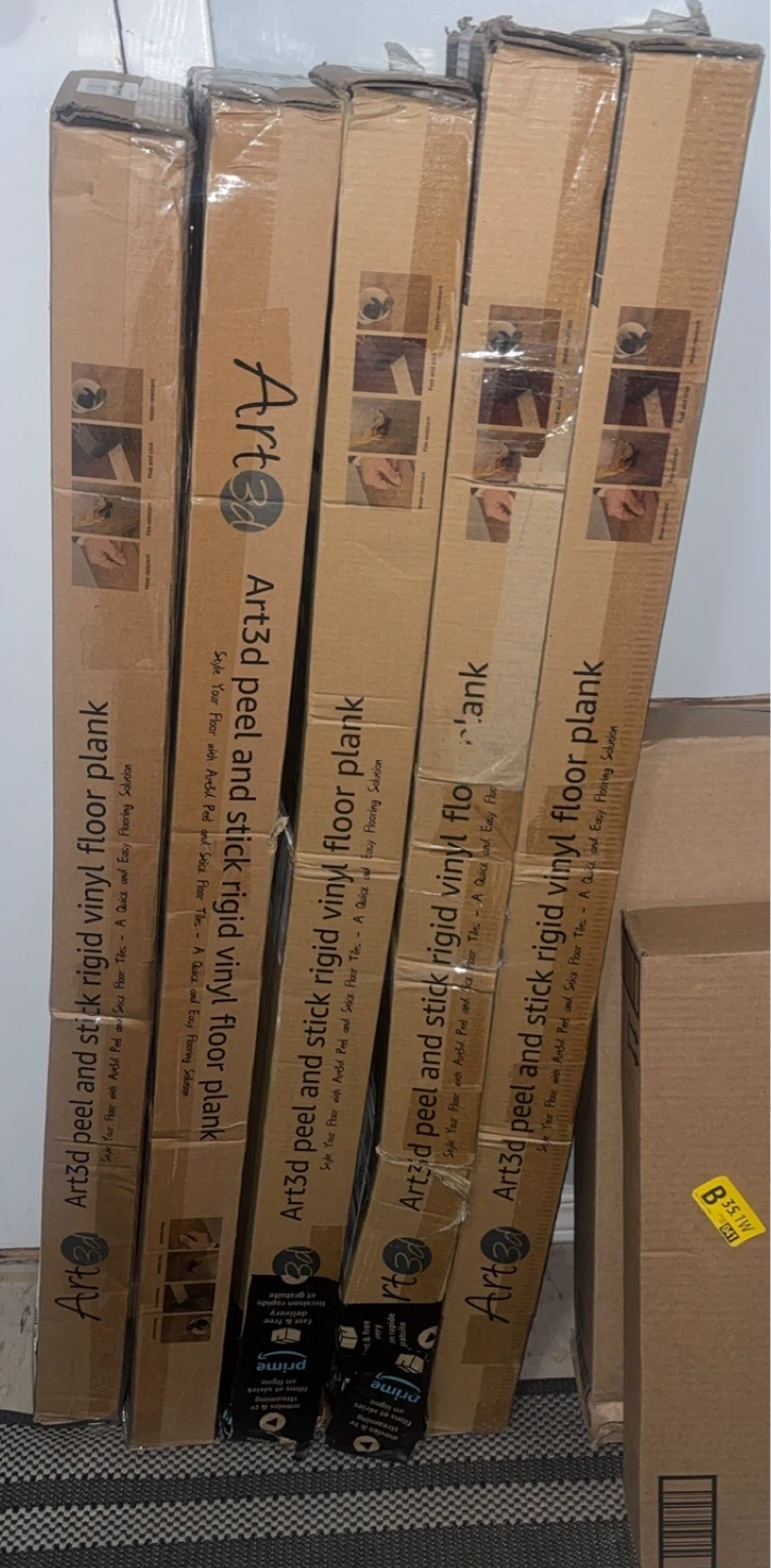 Selling brand new 3 boxes (includes 36 Art3d peel and stick rigid vinyl plank flooring in each box). It's a brown stone colour and has a rigid surface. Great for a DIY self-adhesive flooring project!