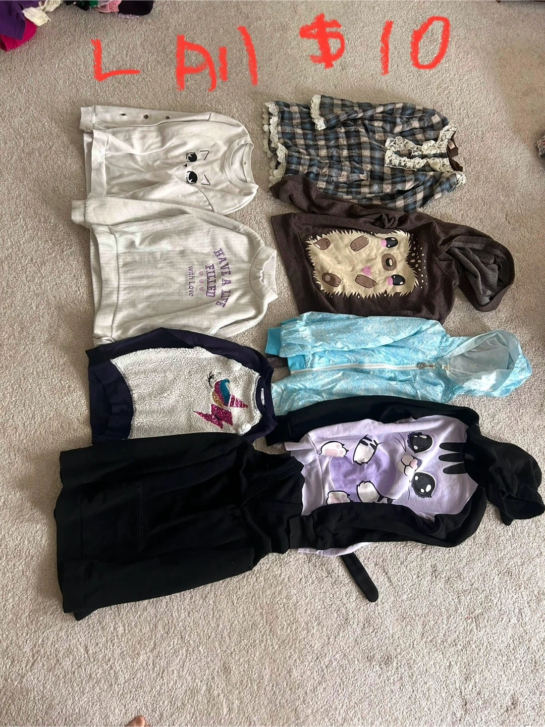A collection of kids' clothes, all in size L! They're $10 for all 8 clothes or $2 each