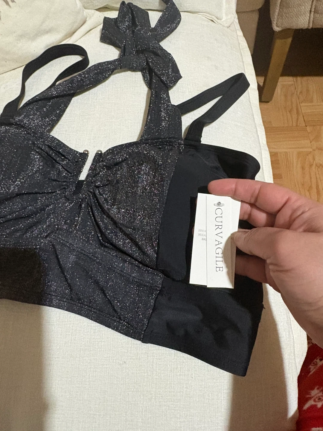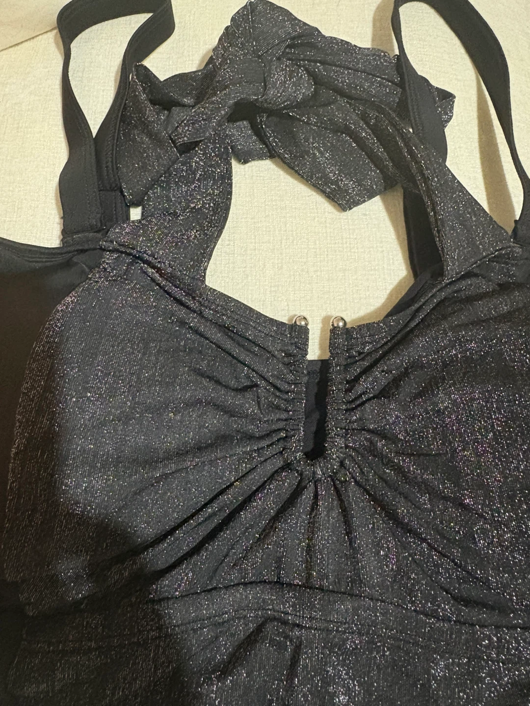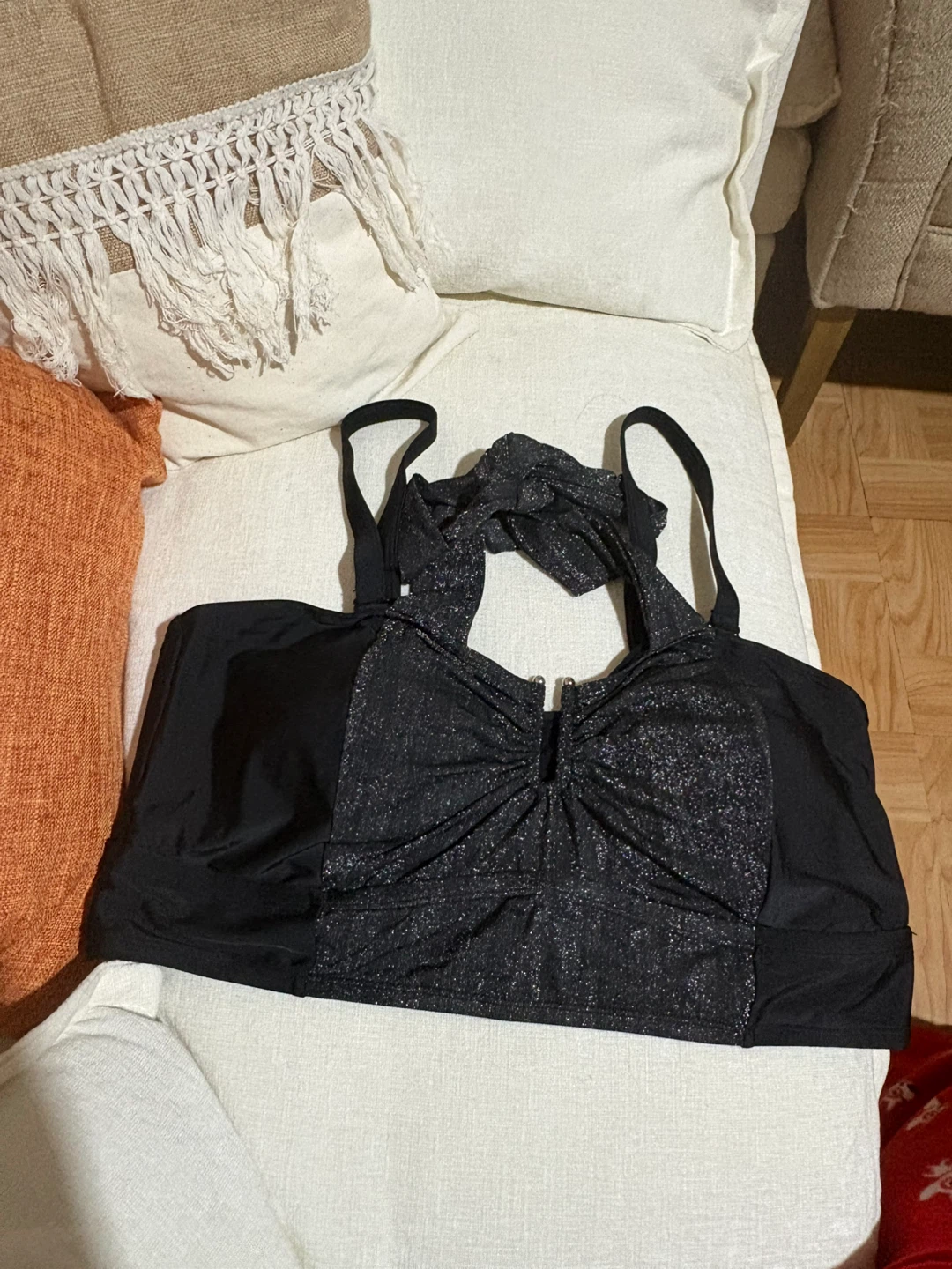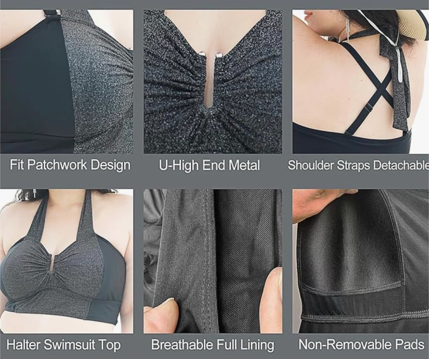 Selling a black halter swimsuit top with a fit patchwork design. It features a U-high end metal detail and detachable shoulder straps. It also has breathable full lining and non-removable pads