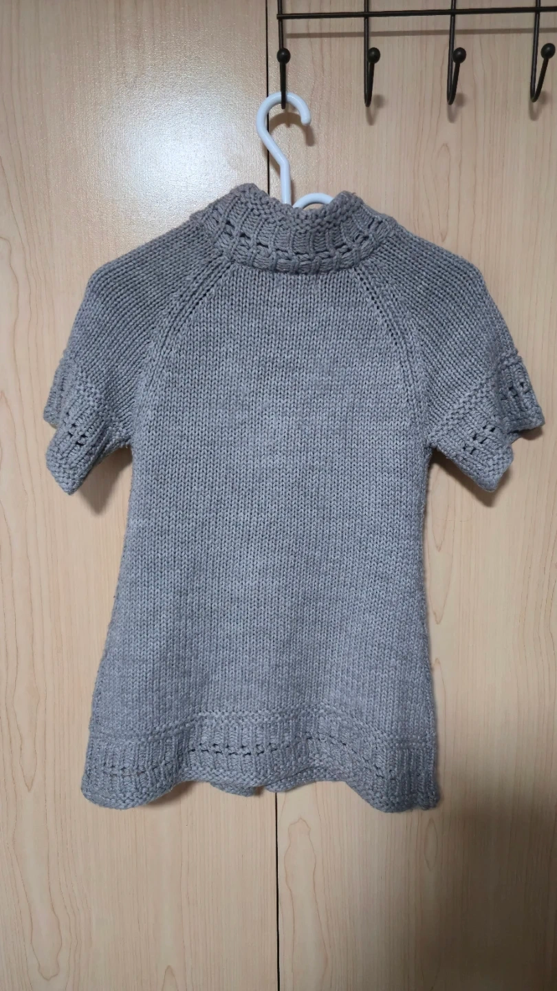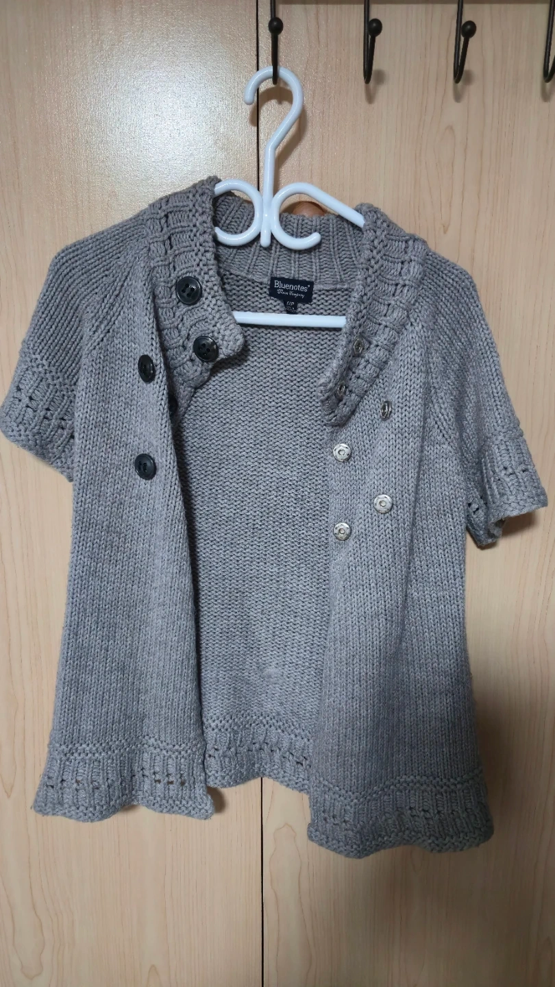 This is a Bluenotes knit cardigan in a lovely grey colour. It features a unique button-up design and short sleeves. Perfect for layering or wearing on its own!