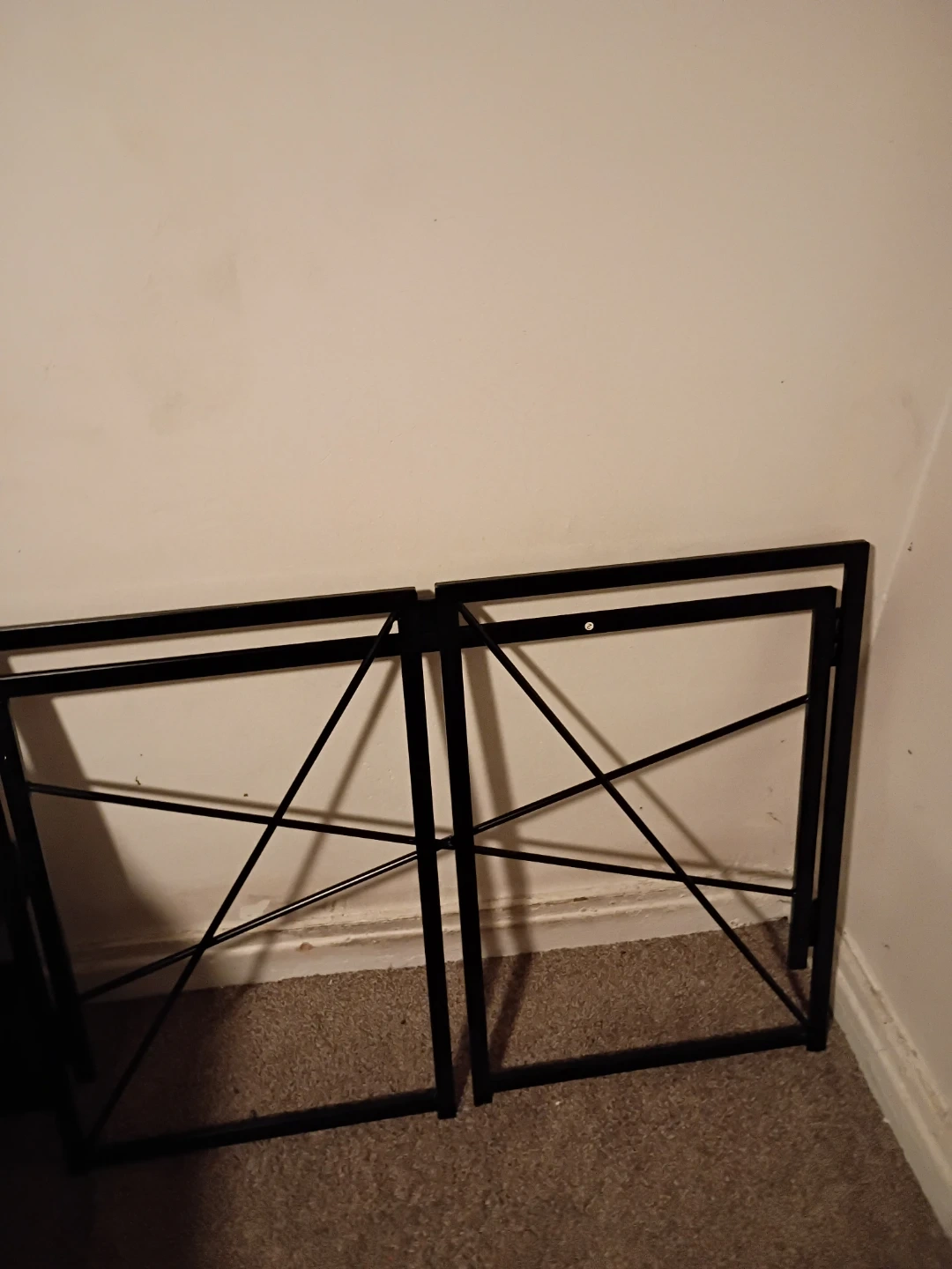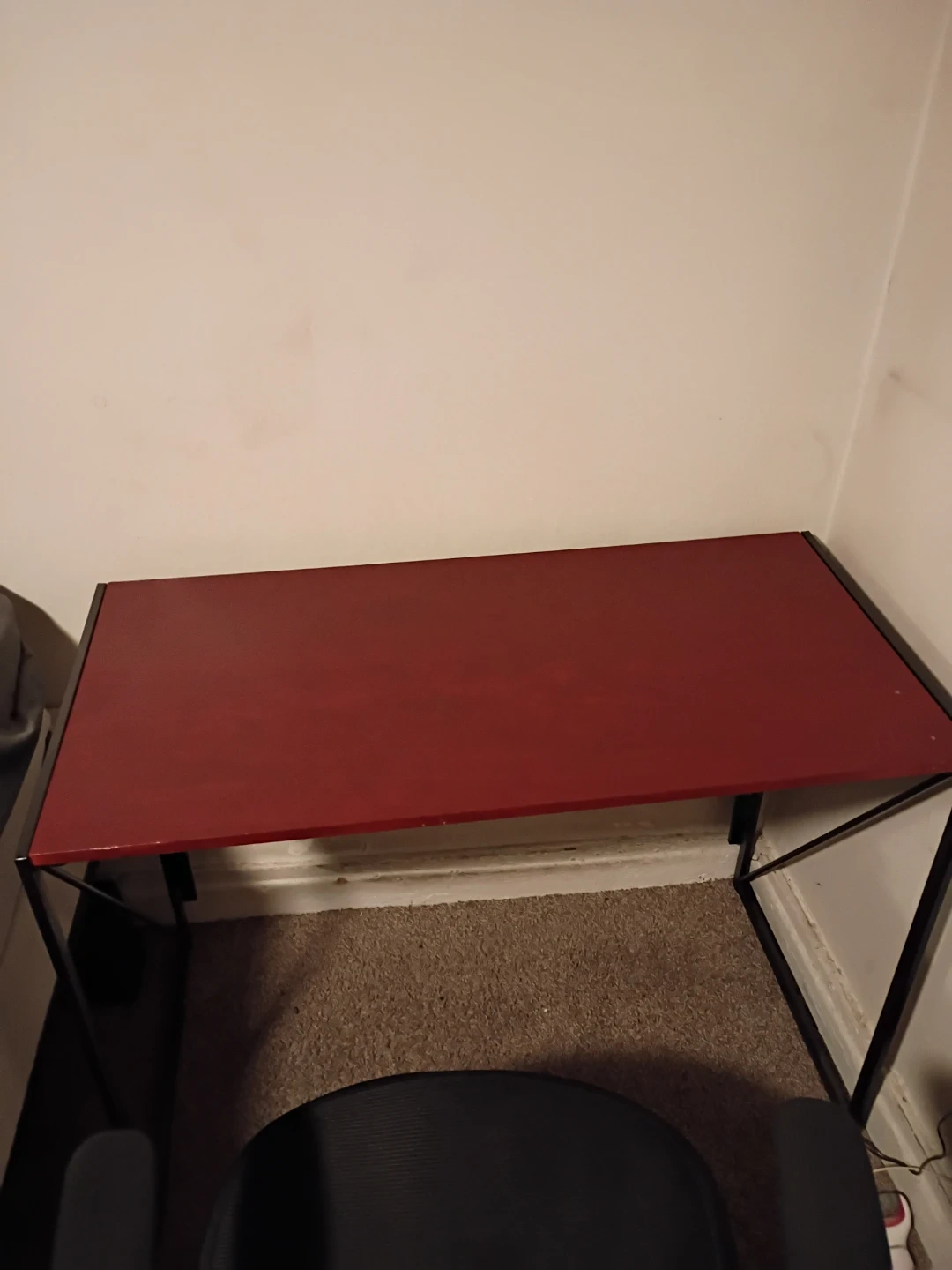 I'm selling a folding desk with a red top and black metal frame. It's in good condition and perfect for small spaces or anyone who needs a desk that can be easily stored away when not in use