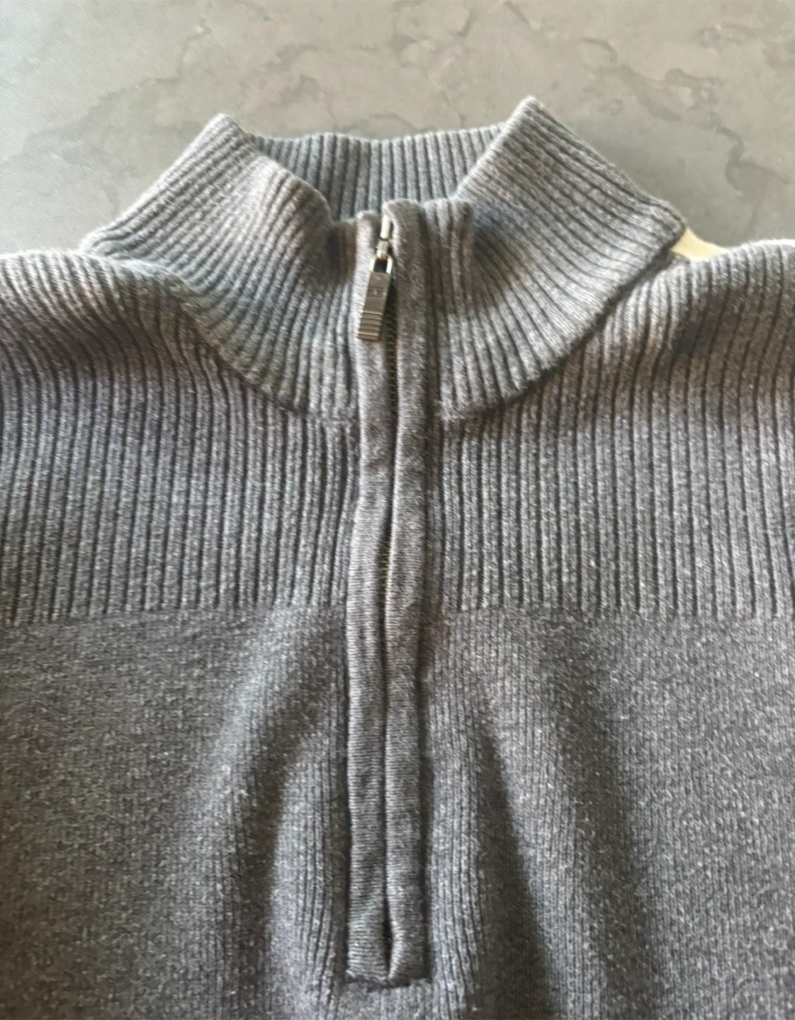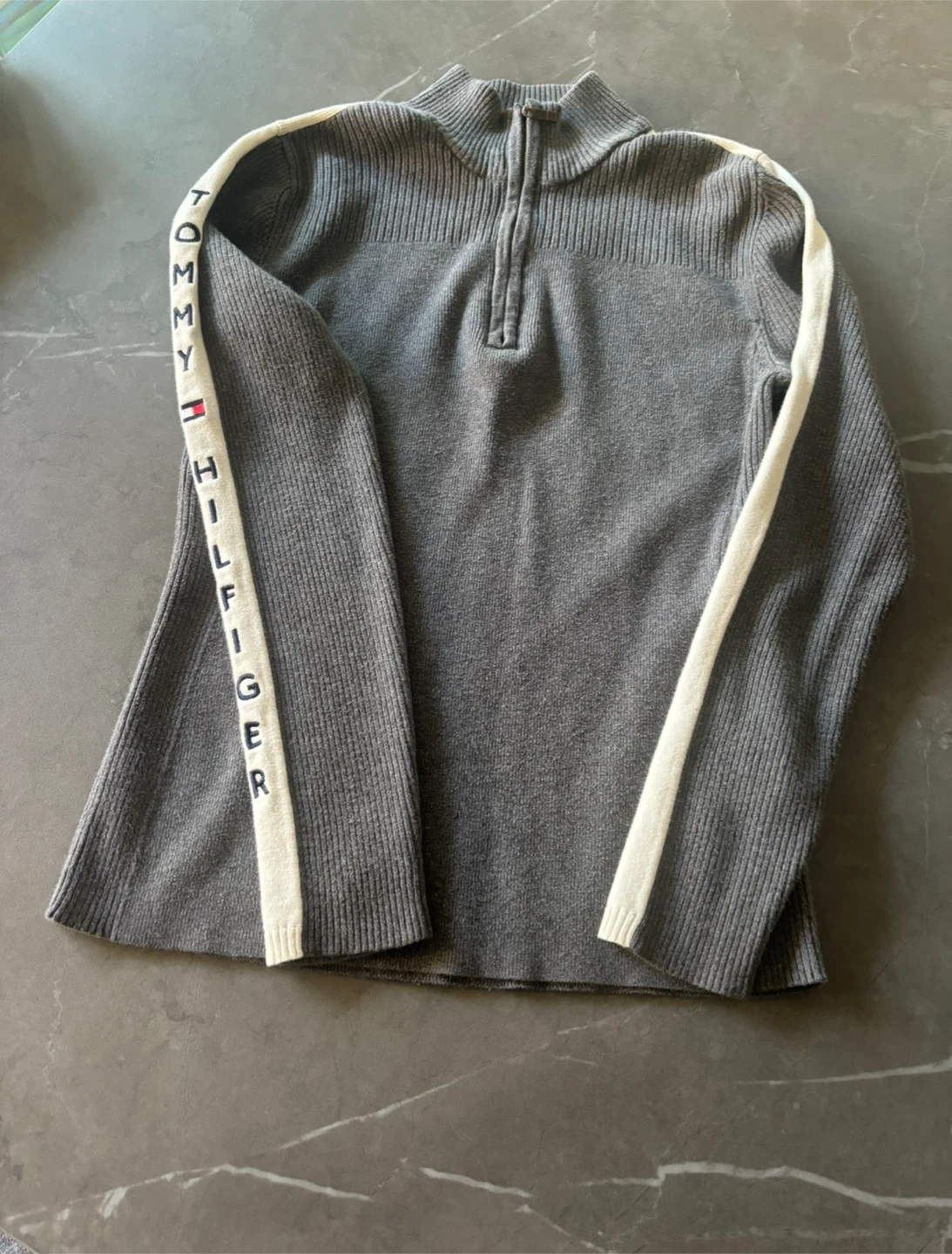 Here's a Tommy Hilfiger grey 1/4 zip sweater in size medium! It features a white stripe down the sleeves with the Tommy Hilfiger logo. Perfect for layering or wearing on its own