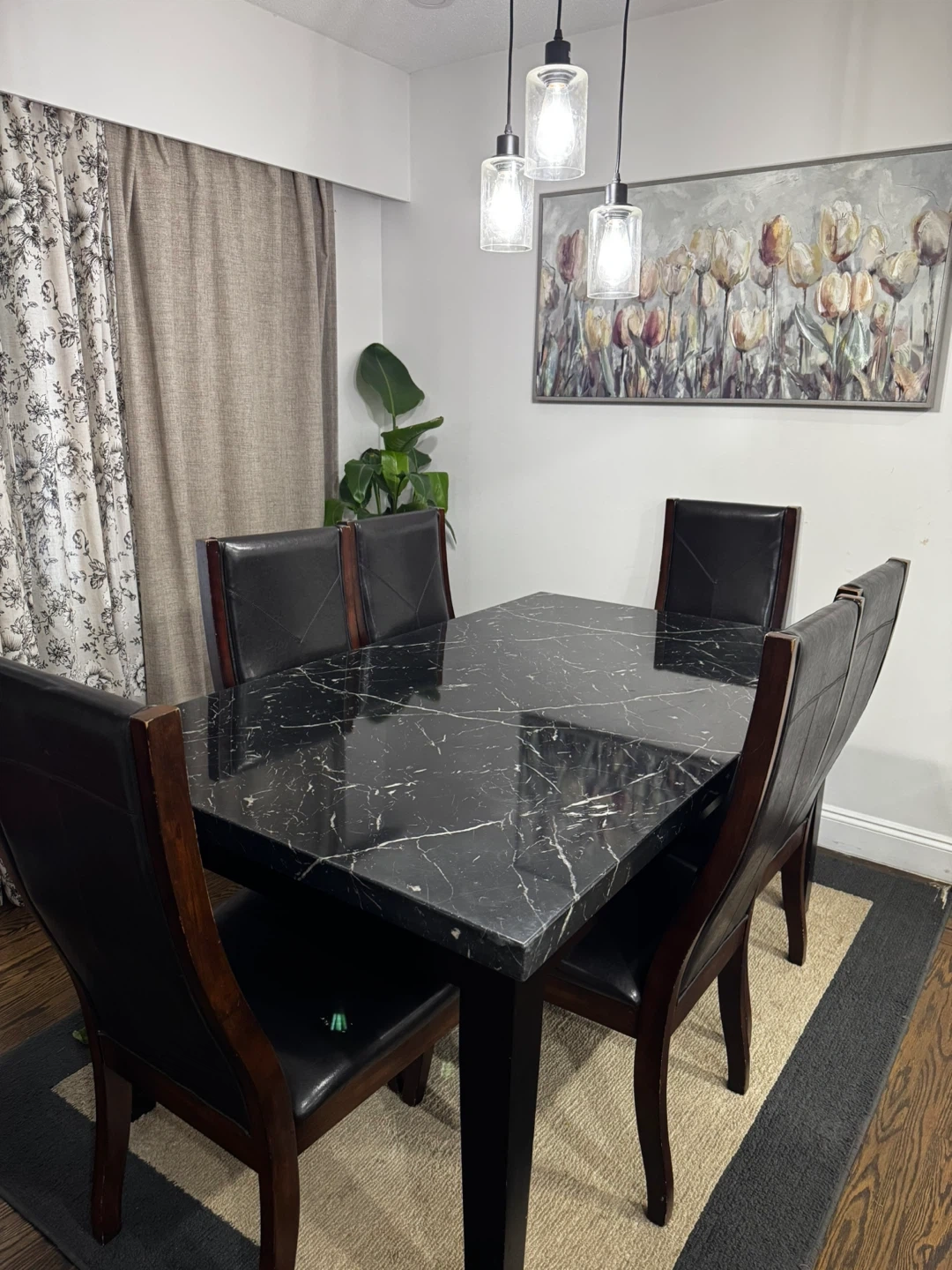 Selling a dining table set that includes a table with a black marble-like top and four chairs with dark brown wooden frames and black leather seats. This set would be a great addition to any dining room!