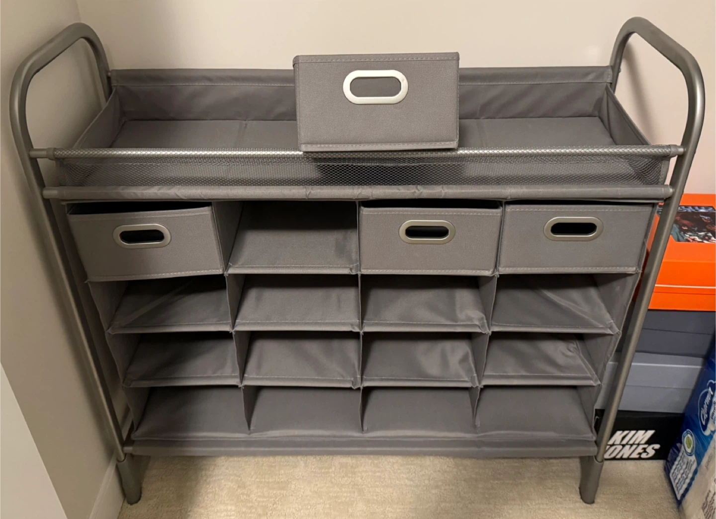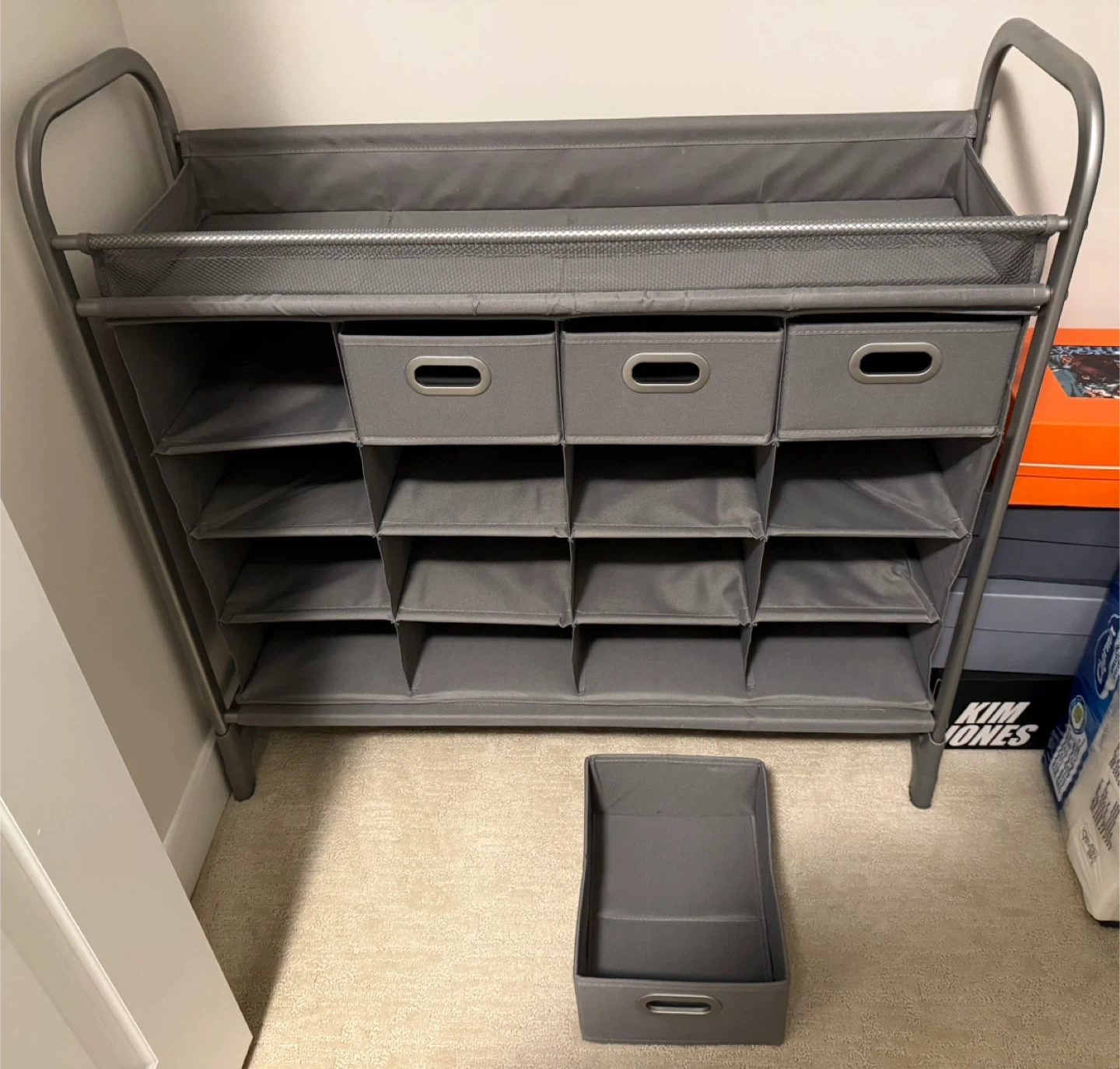 Looking to organize your shoes? This grey shoe rack organizer is perfect for tidying up your entryway or closet. It comes with four storage bins to keep your shoes neatly arranged and easily accessible. It has been erected in great shape, never use and ready to help you declutter!