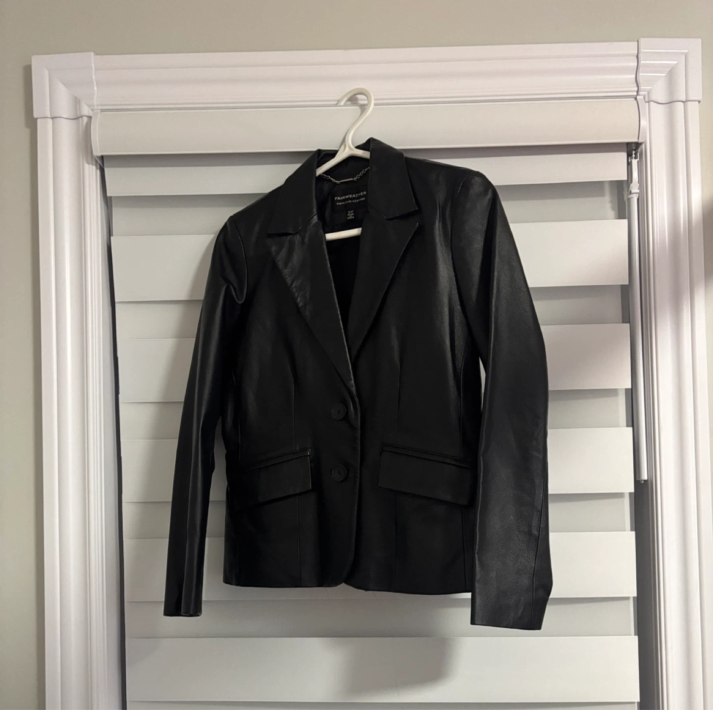 Selling a Fairweather genuine leather blazer in size small. It's a classic black colour and made of 100% leather shell with a 100% polyester lining. The style/model number is FS-3514
