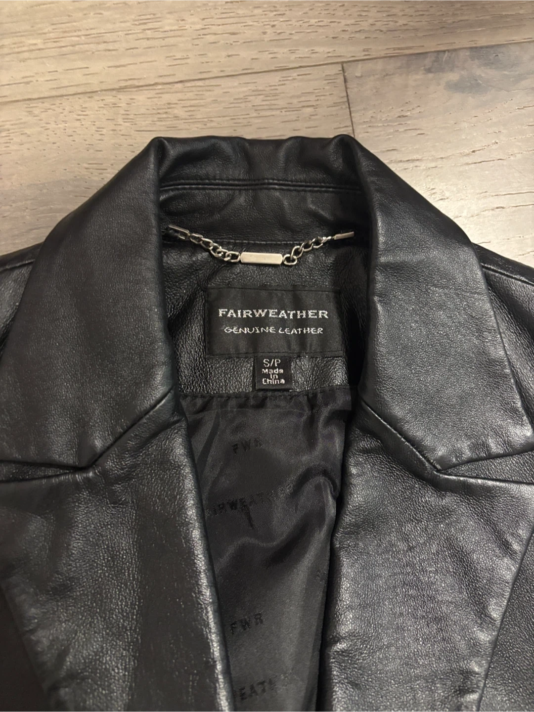 Selling a Fairweather genuine leather blazer in size small. It's a classic black colour and made of 100% leather shell with a 100% polyester lining. The style/model number is FS-3514