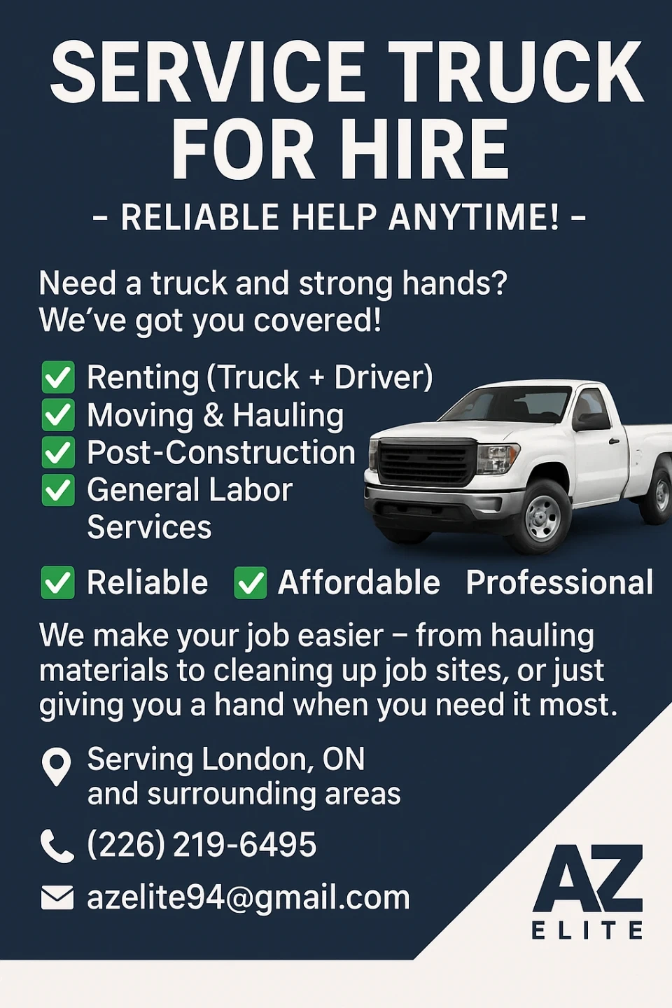 Need a truck and strong hands? We've got you covered! Renting (Truck + Driver), Moving & Hauling, Post-Construction, General Labor Services. Reliable, Affordable, Professional. We make your job easier – from hauling materials to cleaning up job sites, or just giving you a hand when you need it most. Serving London, ON and surrounding areas