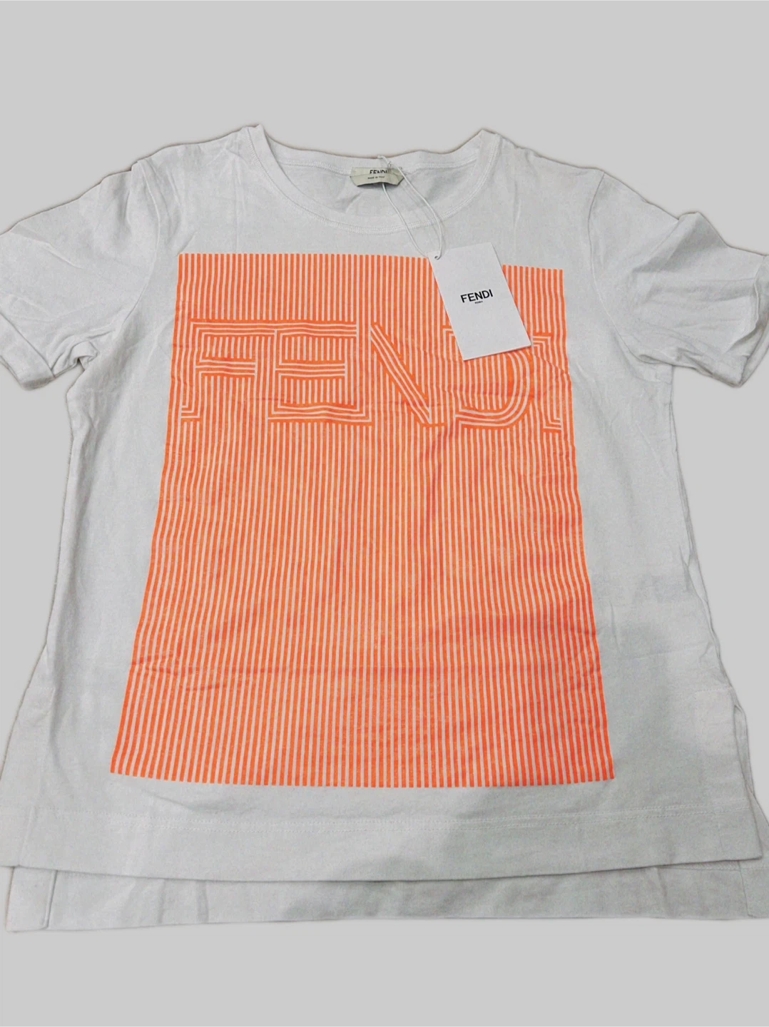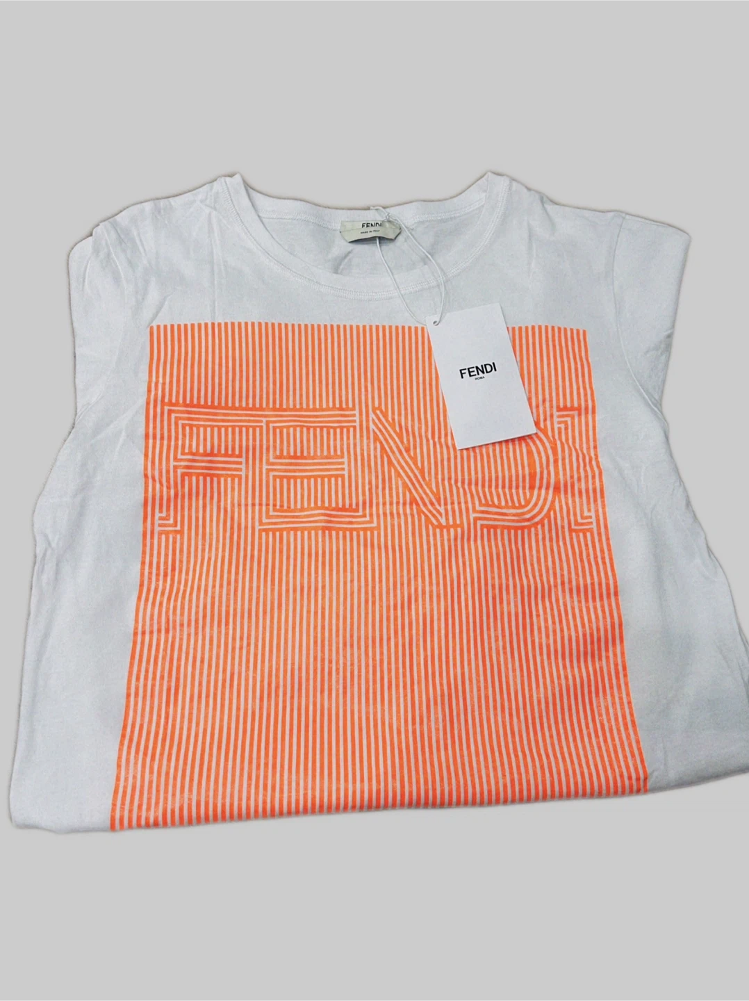 Selling a Fendi Roma T-shirt in excellent condition! The tee is white with a bold orange Fendi logo design. It's made in Italy from 100% cotton and is a size M (Taglia/Size 42). A stylish addition to any wardrobe!