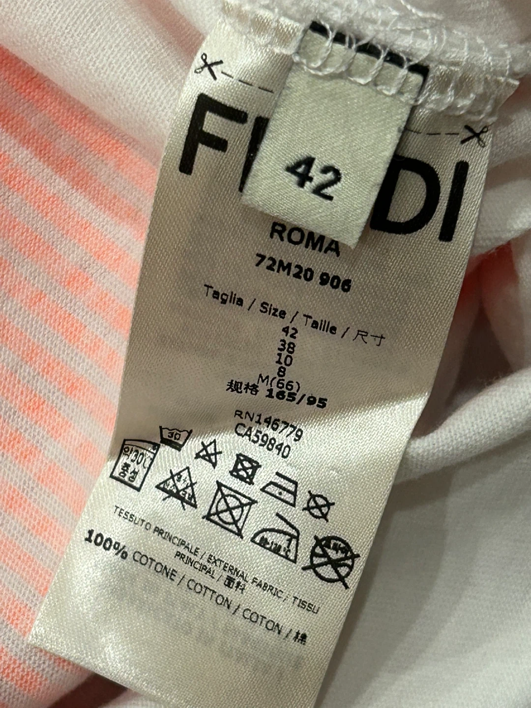 Selling a Fendi Roma T-shirt in excellent condition! The tee is white with a bold orange Fendi logo design. It's made in Italy from 100% cotton and is a size M (Taglia/Size 42). A stylish addition to any wardrobe!