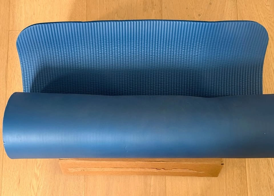 Selling the high-density blue yoga and exercise mat, size: 183cm x 66cm x 10mm. This mat is extra thick, providing excellent cushioning and support for your joints during floor workouts, yoga, or Pilates.