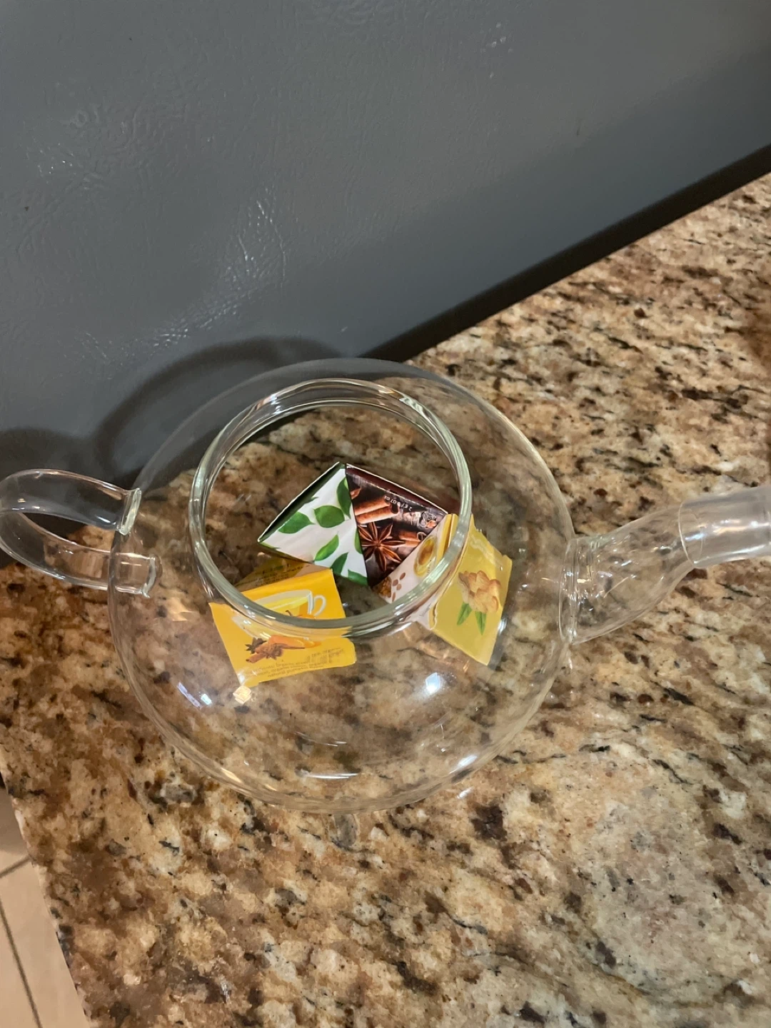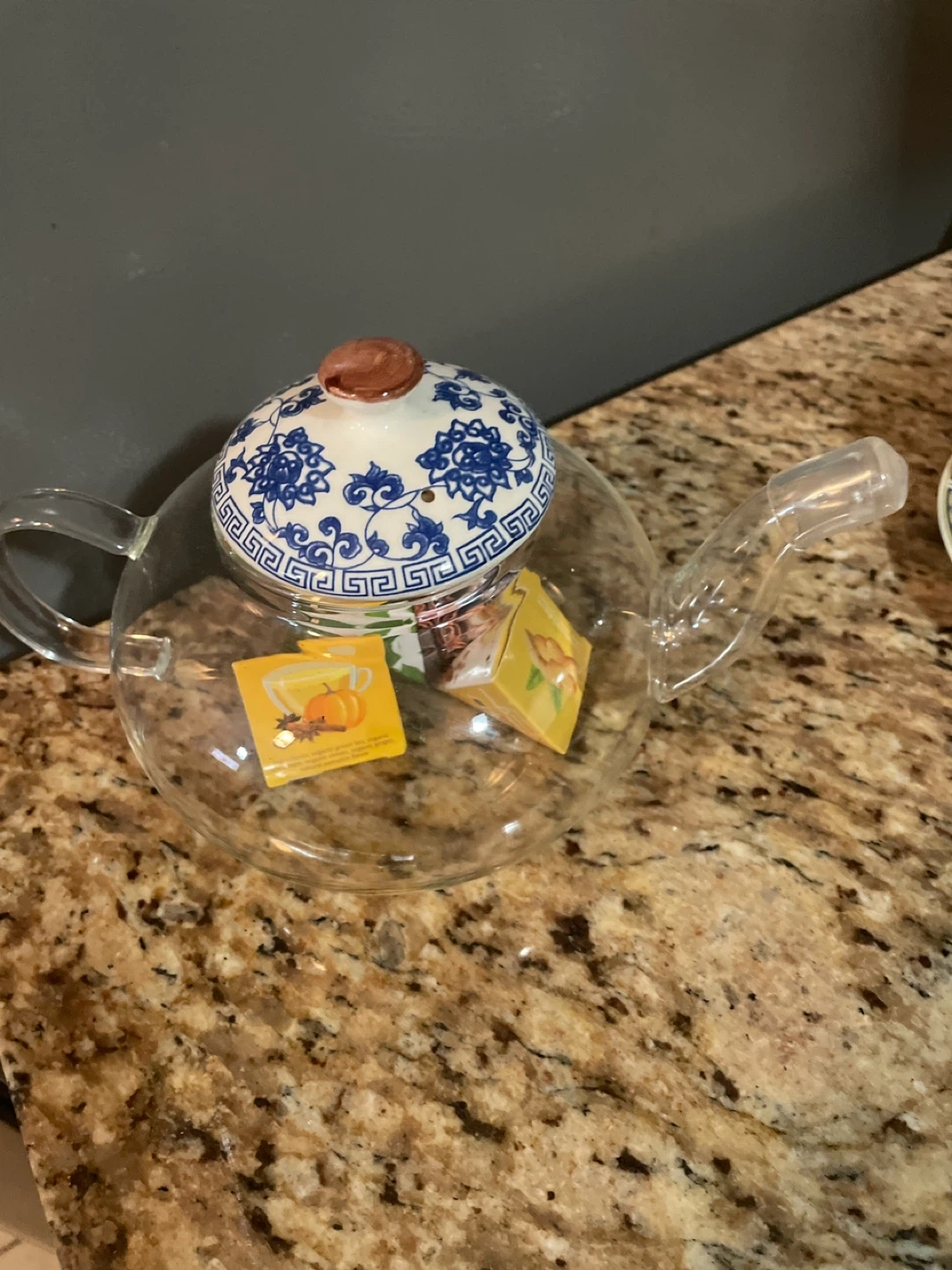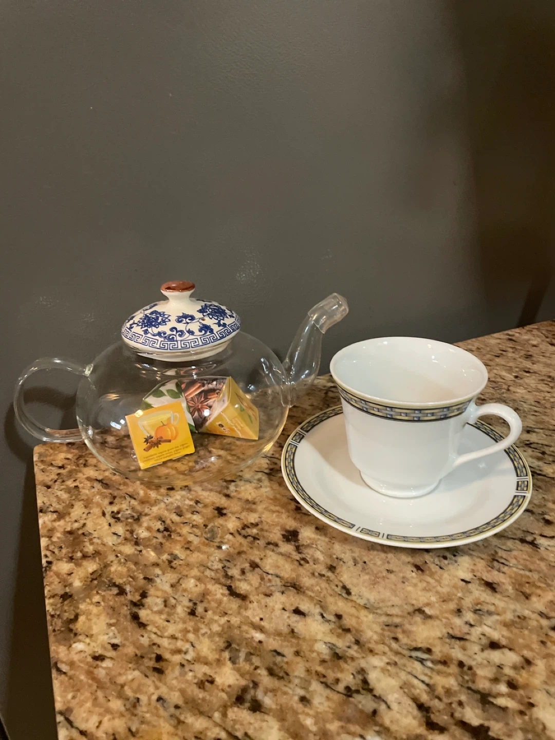 Selling a lovely glass teapot that comes with a cup and saucer set! It also includes a few tea bags to get you started. Perfect for a cozy tea time