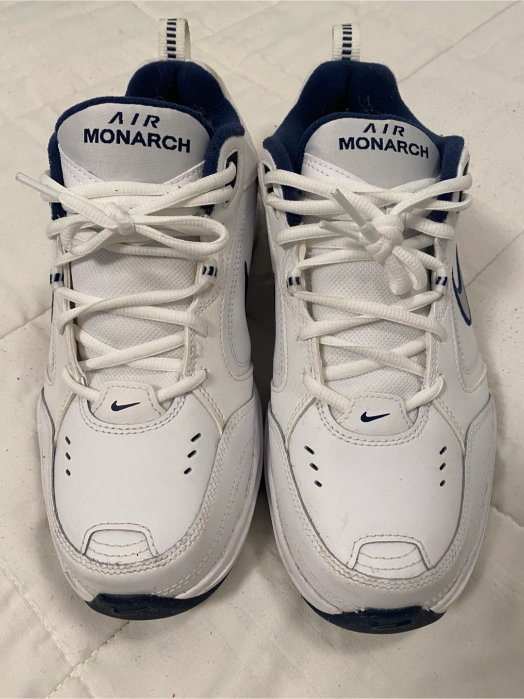 Selling a pair of Nike Air Monarch IV sneakers in white and navy. Hardly worn like new