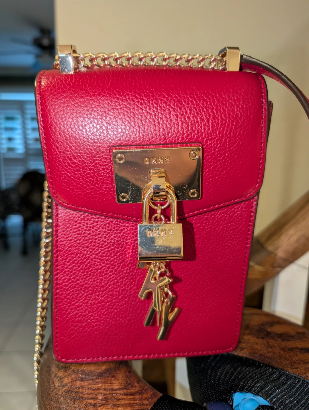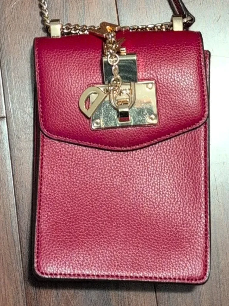 This is a cute crossbody bag in a burgundy colour! It has a gold chain strap and a gold clasp. Perfect for carrying your essentials in style