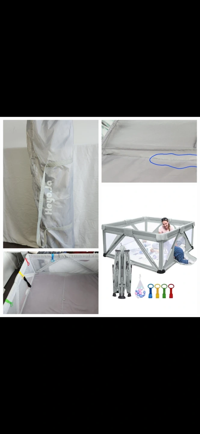 This Heyo.Ja portable playpen is perfect for indoor and outdoor use! It's in cool gray and measures 71x71x59 inches. It's easy to set up and take down, making it great for travel or storage