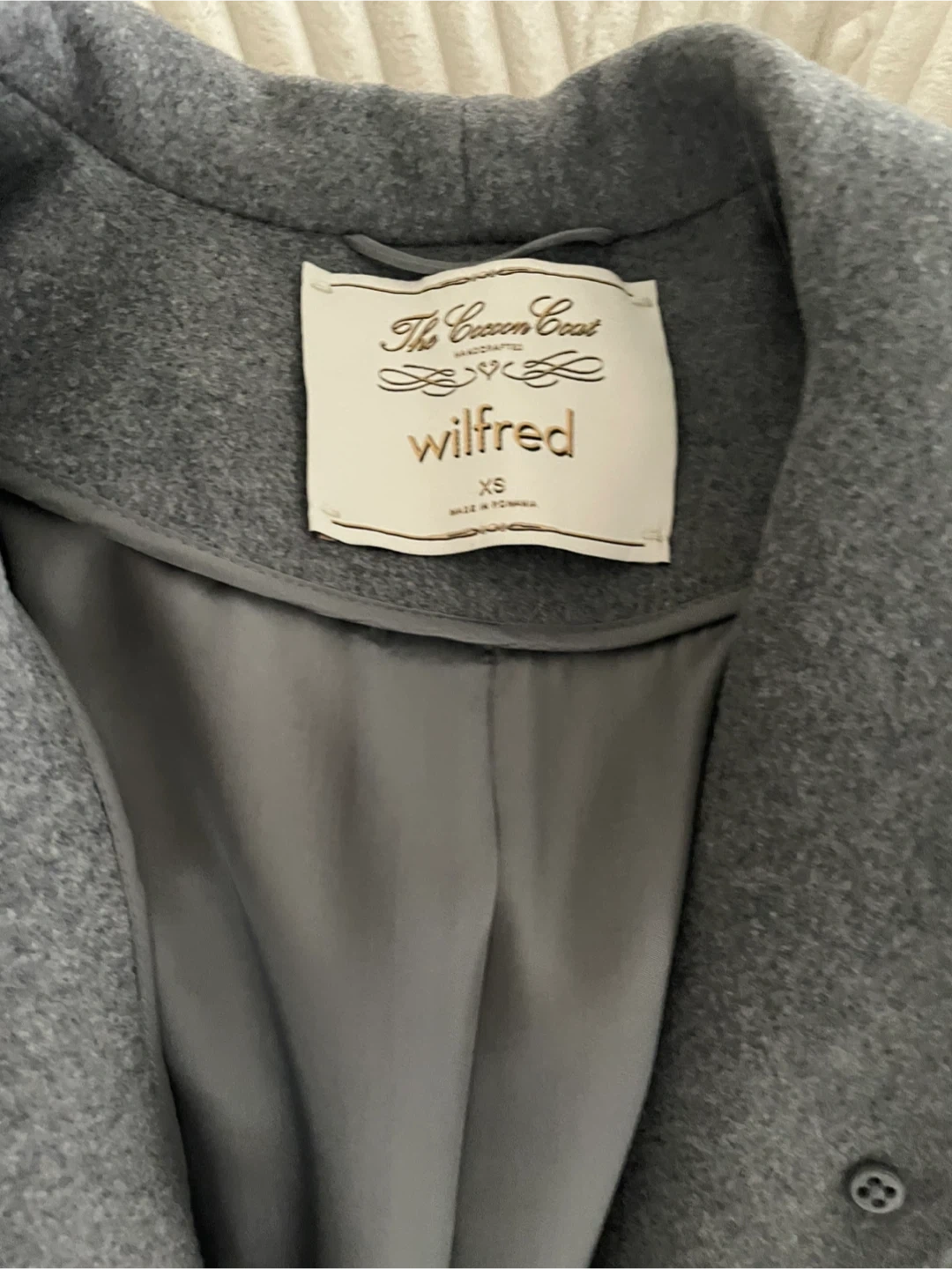 Selling a Wilfred The Cocoon Coat in size XS! It's a beautiful grey colour and made with a wool blend. This coat is in excellent condition and ready to keep you warm this season