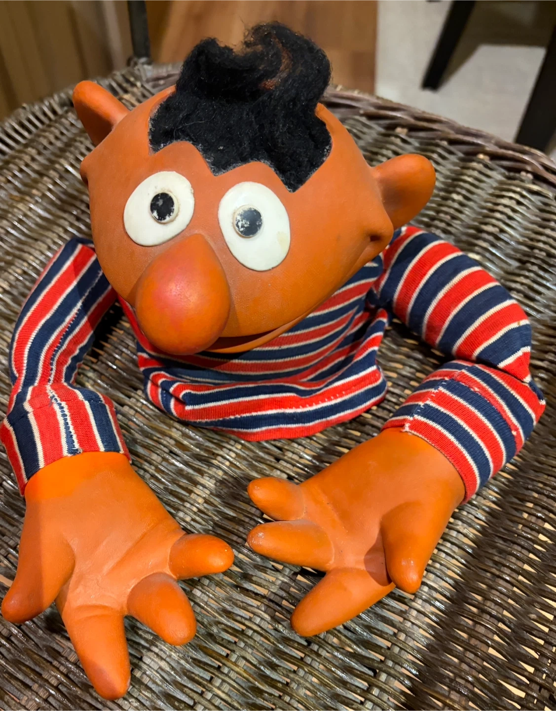 Selling a vintage Ernie puppet. It has a unique design with an orange head and hands, and a striped shirt with red, white, and blue. Great for collectors or fans of classic toys