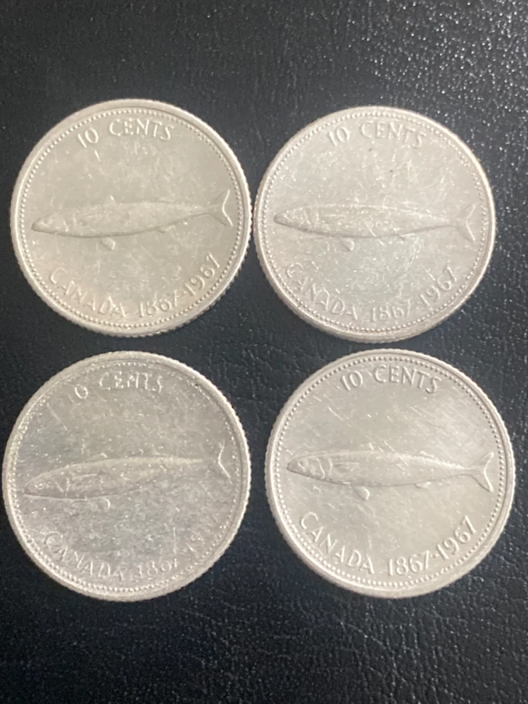 Selling four vintage Canadian silver 10 cent coins from 1967. These coins feature a mackerel design and are a piece of Canadian history! Great for collectors or anyone interested in numismatics