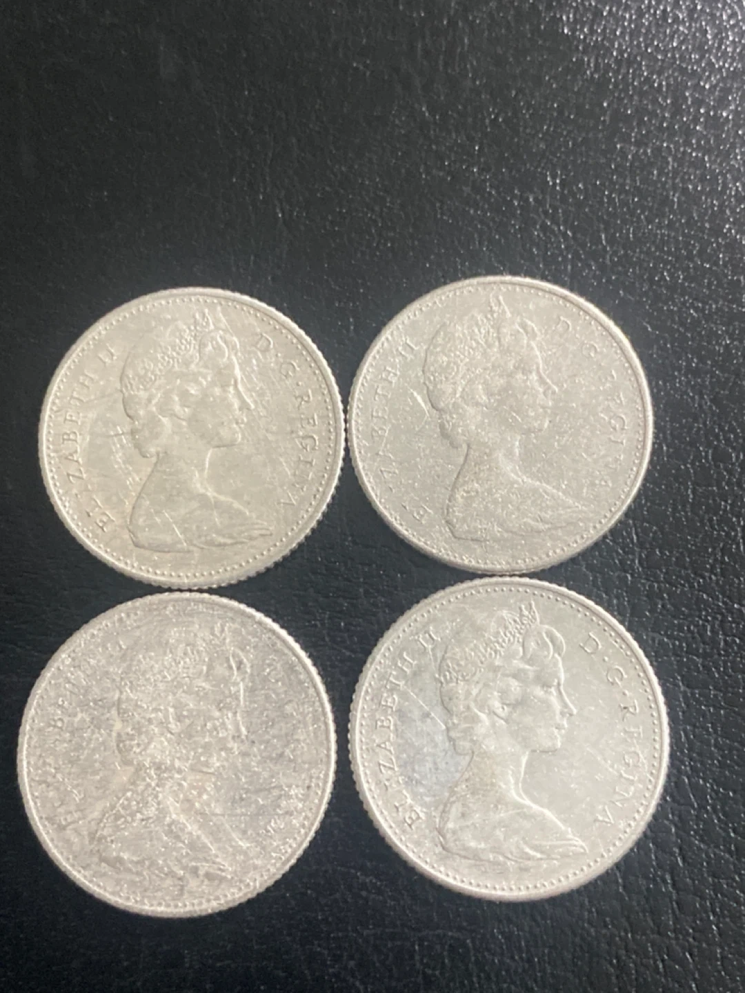 Selling four vintage Canadian silver 10 cent coins from 1967. These coins feature a mackerel design and are a piece of Canadian history! Great for collectors or anyone interested in numismatics