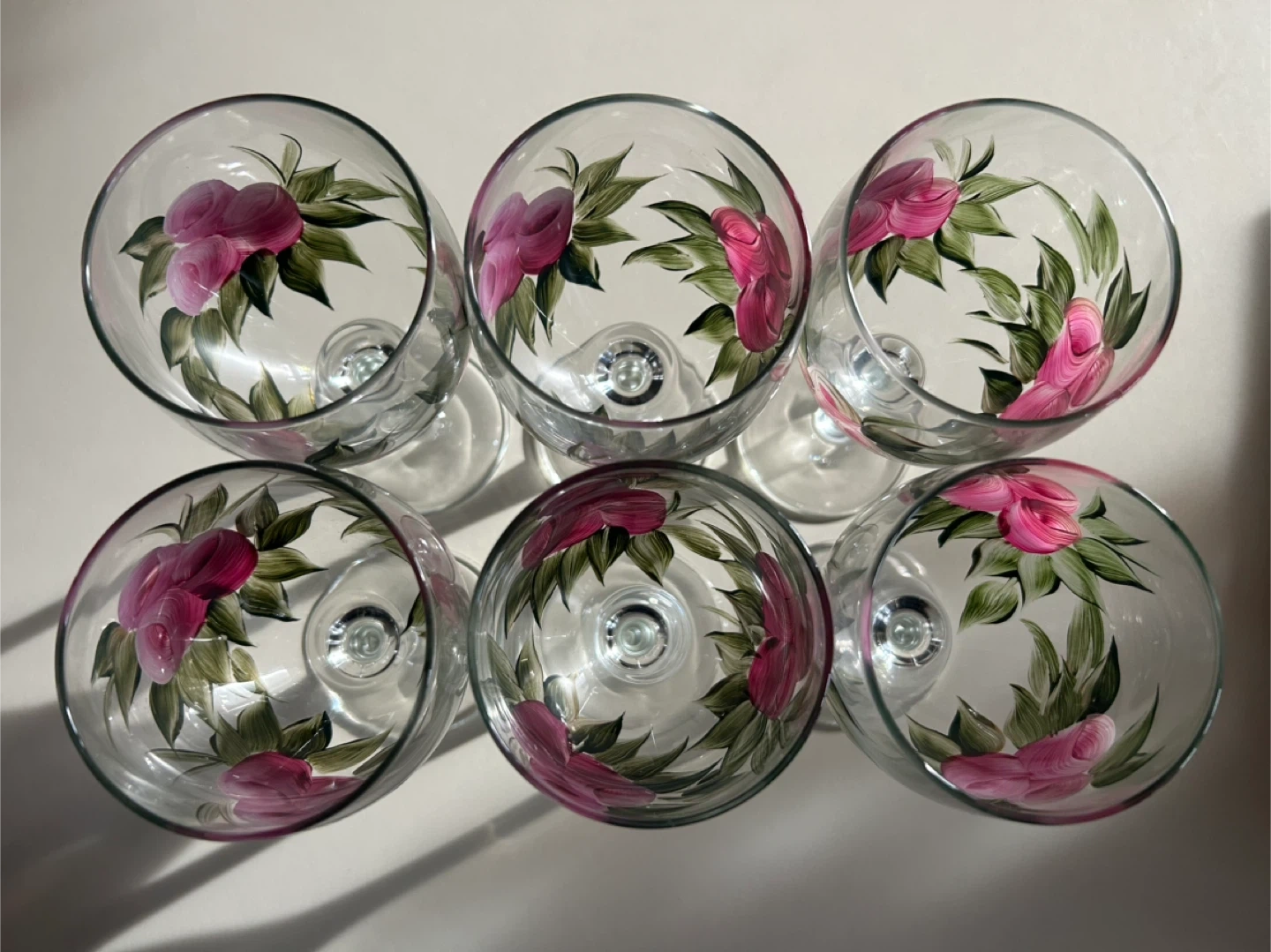 Selling a set of six artisan hand painted wine glasses, each with a pink rose floral design.