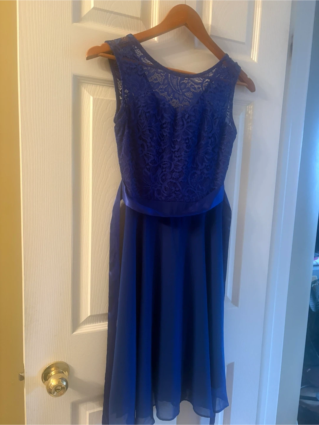 Selling a beautiful blue lace dress. It features a delicate lace bodice and a flowing skirt. Perfect for a special occasion!