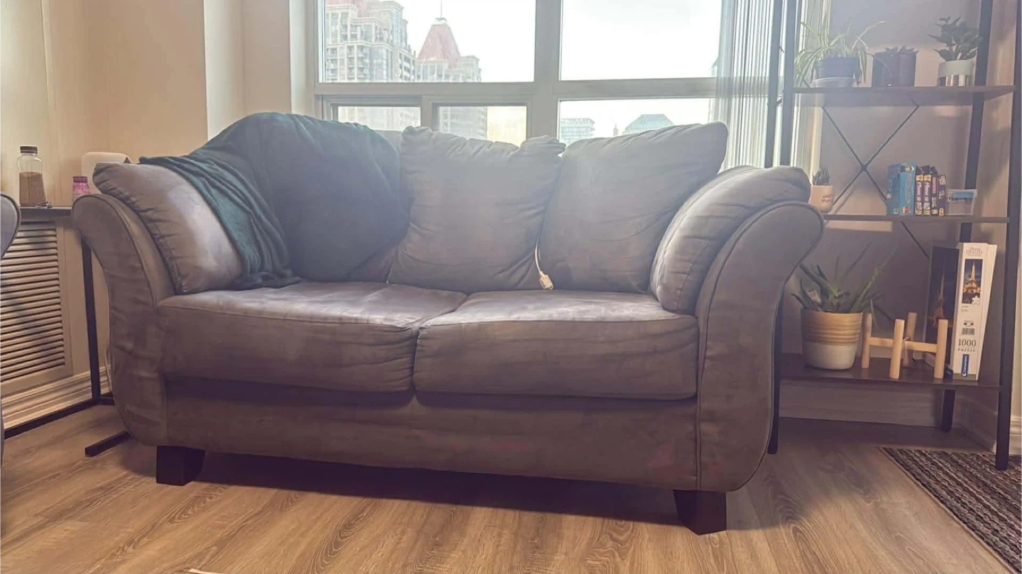Selling a dark grey Collier Loveseat. It's in good condition and would be a great addition to any living room. It's a comfortable and stylish piece of furniture!