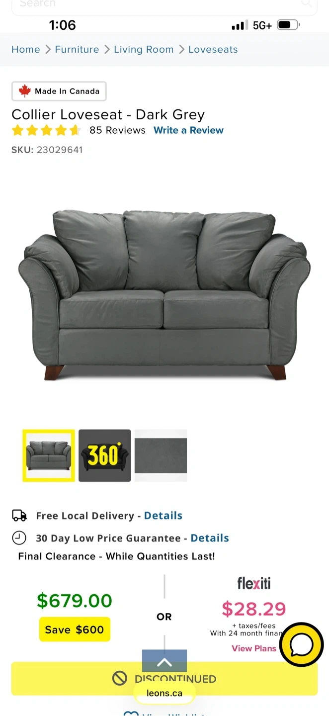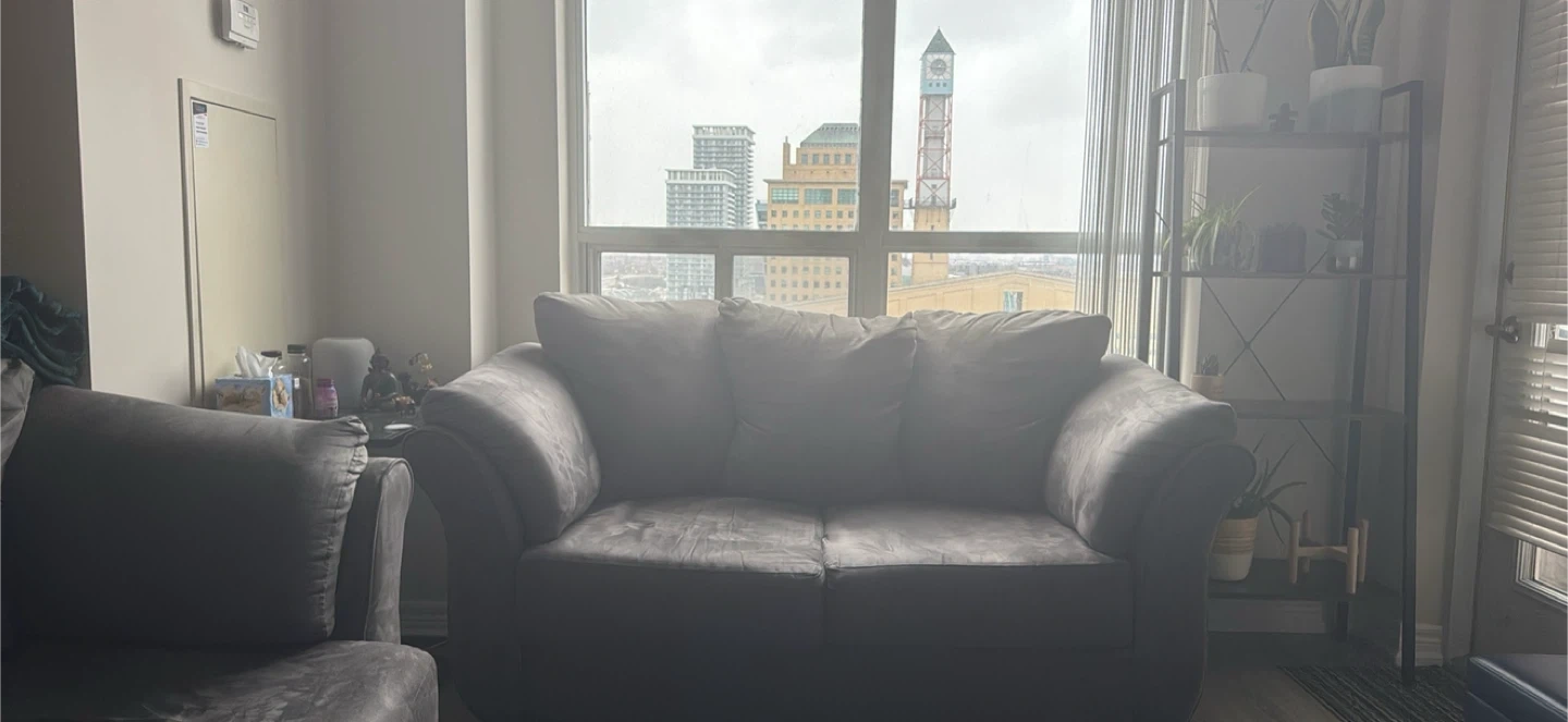 Selling a dark grey Collier Loveseat. It's in good condition and would be a great addition to any living room. It's a comfortable and stylish piece of furniture!