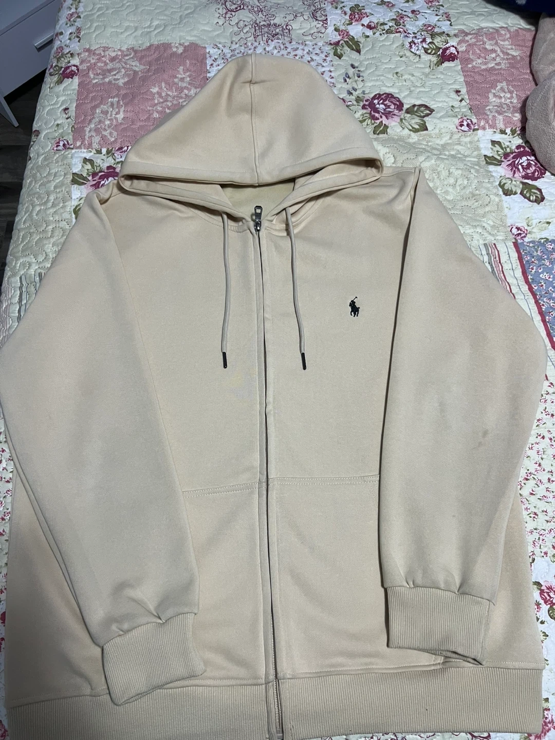 Selling a Ralph Lauren Polo full zip hoodie in size L. It's a light beige colour and in great condition. Perfect for layering or wearing on its own!