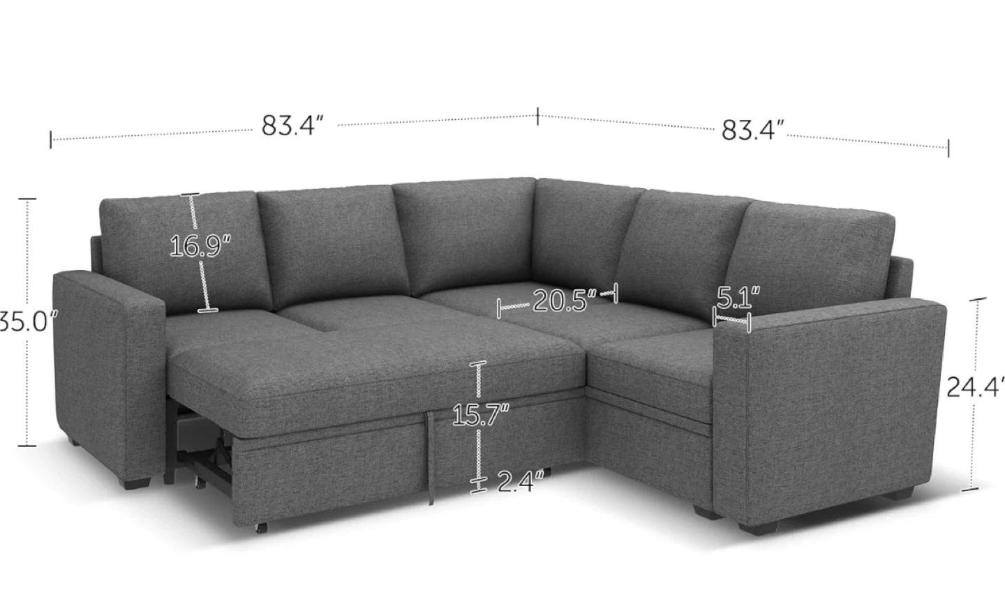 Selling a comfortable gray sectional sofa! It features convenient storage compartments. The dimensions are approximately 83.4" x 83.4" wide and 35" high. The seat depth is about 20.5". This sectional is perfect for a living room or den